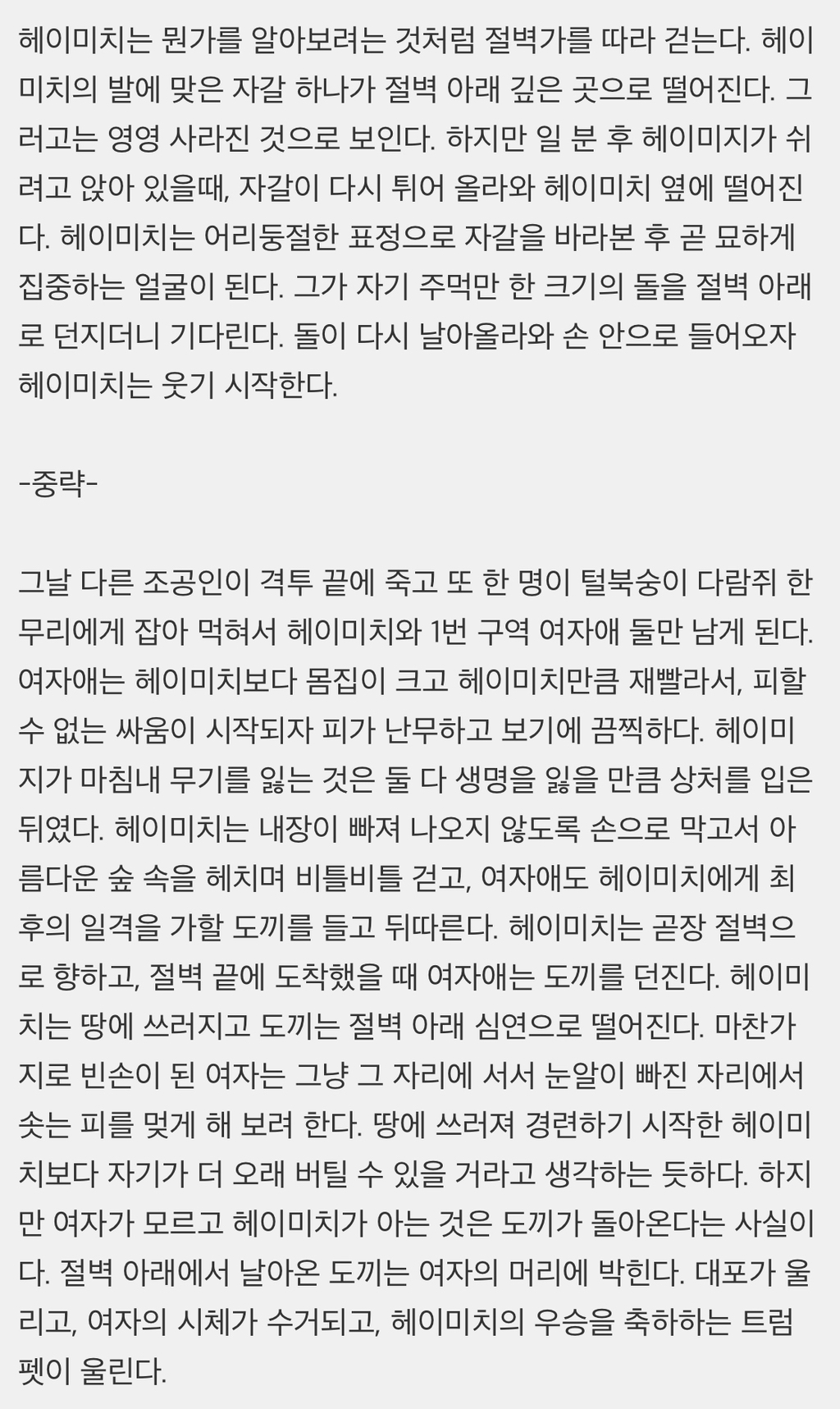 이를 역이용해서 마지막까지 남은 1구역 출신 프로 조공인이 그 절벽 끝에서 본인에게 도끼를 던지도록 유인함