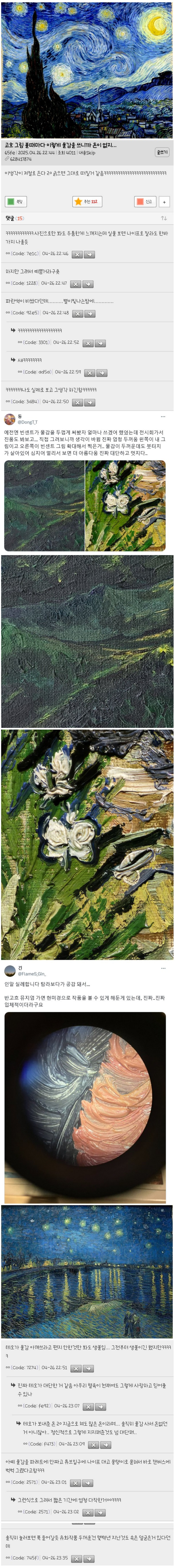 [흥미돋]그림 전시 꼭 실제로 가서 봐야하는 이유 작성자대방어회|작성시간25.11.04|조회수57,682 목록 댓글 22 글자크기 작게가 글자크기 크게가 출처: 더쿠https://theqoo.net/square/3978696900 실제로 보면 돈지랄 했나 안했나 확인 가능함 다음검색 현재 게시글 추가 기능 열기 북마크 공유하기 신고 센터로 신고 댓글 댓글 22 댓글쓰기 답글쓰기 댓글 리스트 작성자혹등고랴 | 작성시간 25.11.04 나도 찍었었는데 사진엔 잘 안나왔지만 진짜 두껍더라 고흐 이미지 확대 작성자조쉬 코헨 | 작성시간 25.11.05 테오 ㄹㅇ 보살 작성자-2kg | 작성시간 25.11.05 그림 하나에 물감 진짜 많이 썼더라 작성자연예인찬양좀그만해 | 작성시간 25.11.05 돈도 없으면서 저런 기법을 구사했다는게........ ㅋㅋ 테오야..... 고생했다..... 작성자곁들여진 | 작성시간 25.11.05 진짜 물감 그자체더라..그래서 더 진짜같아 댓글 전체보기