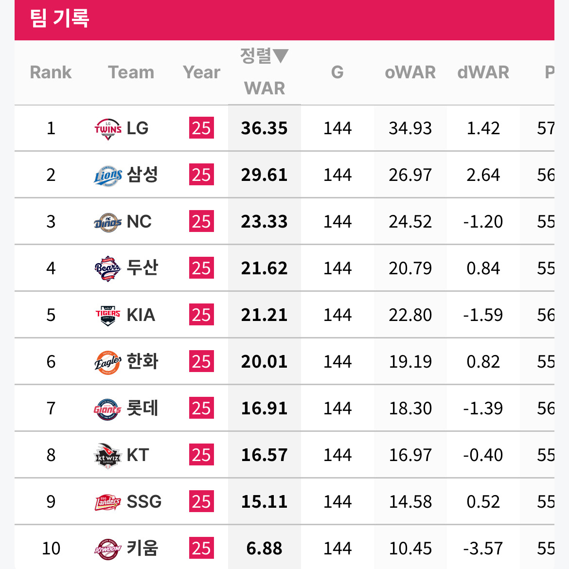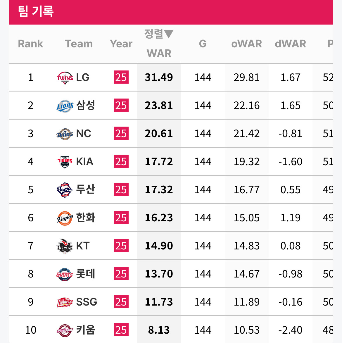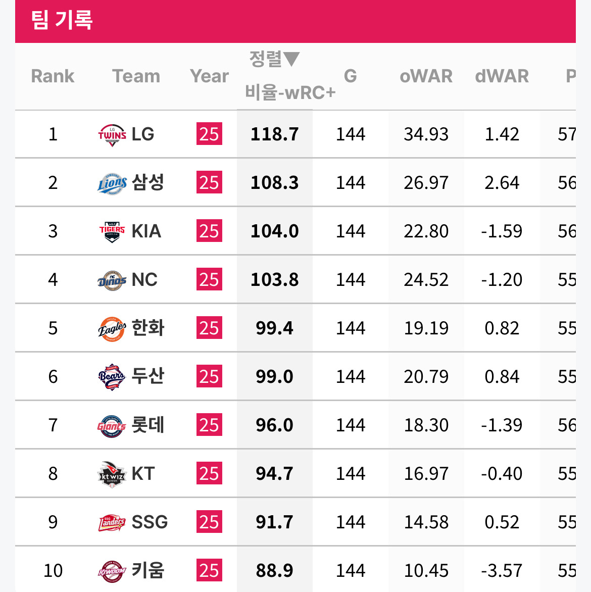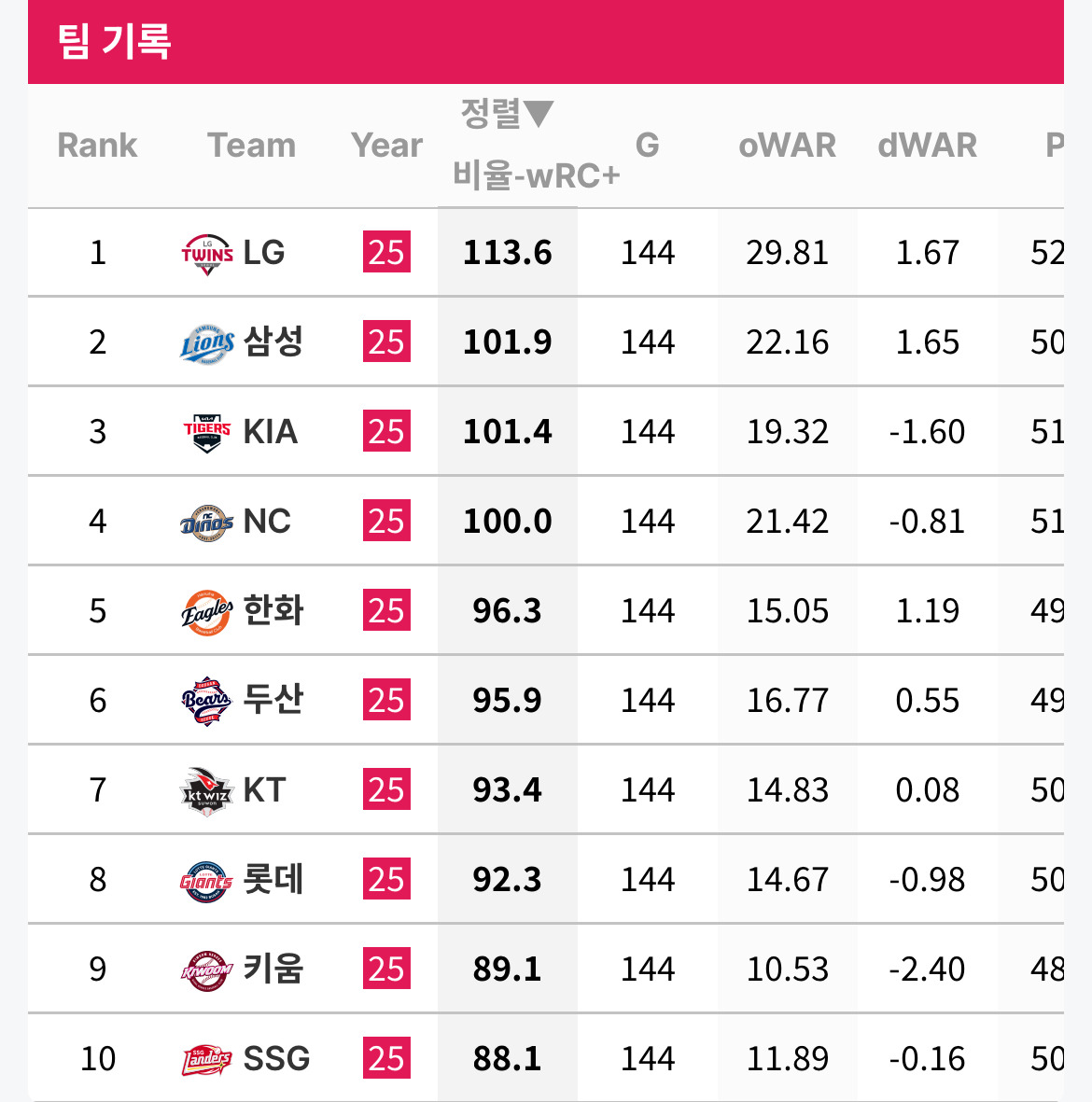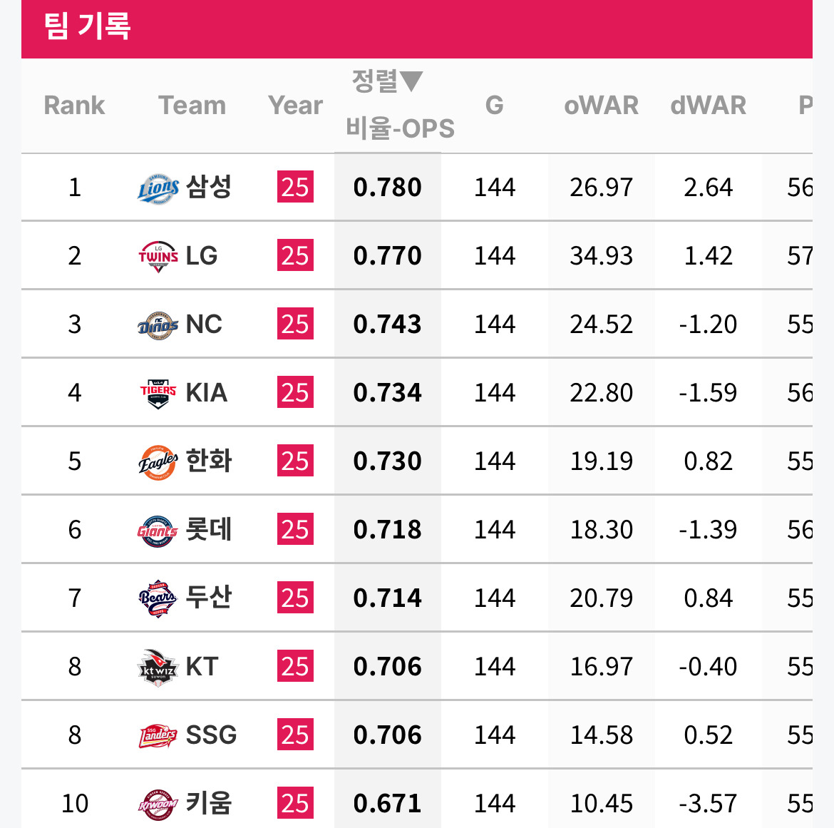 [흥미돋][KBO] 팀 타격 순위 (용병포함/미포함) 작성자커피드립|작성시간25.11.04|조회수3,939 목록 댓글 31 글자크기 작게가 글자크기 크게가 출처: https://theqoo.net/kbaseball/3978920784용병 포함용병 미포함상위 4팀 / 하위 4팀이 순위만 다를뿐 똑같음.... 다음검색 현재 게시글 추가 기능 열기 북마크 공유하기 신고 센터로 신고 댓글 댓글 31 댓글쓰기 답글쓰기 댓글 리스트 작성자내 꿈은 돈 많은 백수 | 작성시간 25.11.05 기아야... 작성자아방아방 | 작성시간 25.11.05 으휴 작성자휘둥이 | 작성시간 25.11.05 두산 생각보다 솜방망이는 아니었네. 김원형감독님 택연이한테 이제 결정구를 하사해주셈............ 작성자딸기티라미슈 | 작성시간 25.11.05 우리 진짜 투수빨로 가을야구갔구나ㅜ 작성자엽기닦볶음탕 | 작성시간 25.11.05 삼성아 내년엔 우승하자 댓글 전체보기