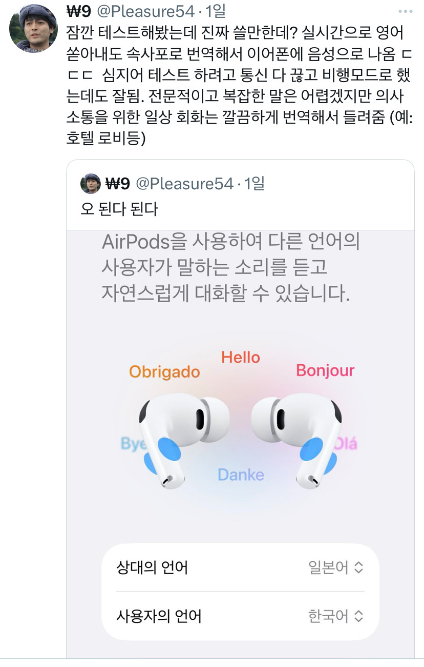 [흥미돋]에어팟 실시간 통역 후기 .X 작성자Eyeeepiee|작성시간25.11.05|조회수135,798 목록 댓글 186 글자크기 작게가 글자크기 크게가 출처: https://x.com/pleasure54/status/1985602404214325626?s=46&t=49r3Kw6TNqvpiTF8J4JDaA 다음검색 현재 게시글 추가 기능 열기 북마크 공유하기 신고 센터로 신고 댓글 댓글 186 댓글쓰기 답글쓰기 댓글 리스트 작성자승승장구대성할여시 | 작성시간 25.11.10 너무 좋다…. 여행이 너무 재밌겠다 작성자바코드닉안되는구나 | 작성시간 25.11.11 그렇게오늘도 182728명의통역사들이 일자리를잃었다고한다.근데진짜좋은세상이다... 해외여행가면겁나요긴할듯 아 나만끼면되는게아니구나 그래도 작성자Pongpong | 작성시간 25.11.12 프로3?? 작성자아원츄 | 작성시간 25.11.15 좋당좋당 작성자푸드케이크 | 작성시간 25.11.16 우유ㅏ 댓글 전체보기