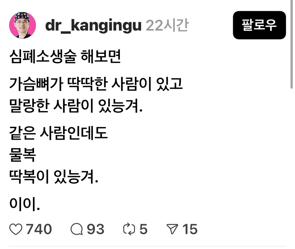 [흥미돋]심폐소생술해보면 같은 사람인데도 물복이 있고 딱복이 있다함.jpg 작성자립살리스|작성시간25.11.05|조회수67,725 목록 댓글 57 글자크기 작게가 글자크기 크게가 출처: https://www.threads.com/@dr_kangingu/post/DQoVYPlkpo8?xmt=AQF0mumQffWS07POrmklMYrJrL_39Wb_Gv3fYnNNnNtyfga9Cf2agkUqMBz3nMjfNWueKbQ&slof=1궁금하다 내가 물복일지 딱복일지ㅋㅋㅋㅋ 다음검색 현재 게시글 추가 기능 열기 북마크 공유하기 신고 센터로 신고 댓글 댓글 57 댓글쓰기 답글쓰기 댓글 리스트 작성자백수준비생 | 작성시간 25.11.05 난 완전 딱복 작성자수영마스터 | 작성시간 25.11.05 심폐소생술은 아니고 가족들 등 마사지 해주는데 아빠는 물복이고 엄마언니는 딱복이야 ㅋㅋㅋㅋㅋㅋ 작성자글 쿤 | 작성시간 25.11.05 나약간 물복 작성자닭발조아 | 작성시간 25.11.05 딱복일것갘아 작성자앙버터소금빵 | 작성시간 25.11.13 난 딱복인데 얇은딱복같어.. 댓글 전체보기