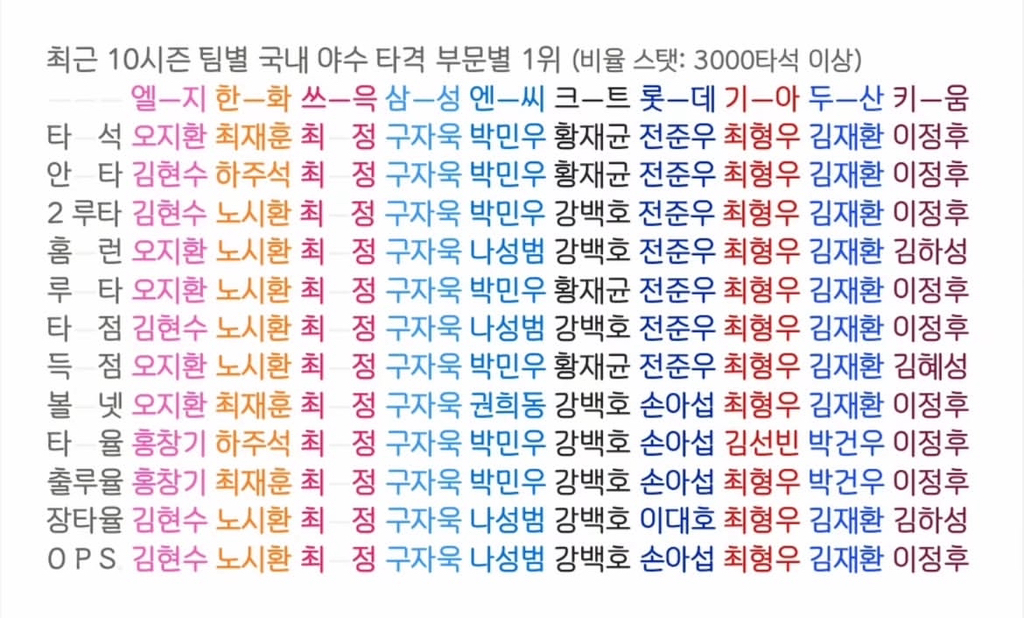 [흥미돋][야구] 최근 10시즌 팀별 국내 야수 타격 부문별 1위 작성자죄송합니다겠냐고|작성시간25.11.05|조회수6,175 목록 댓글 20 글자크기 작게가 글자크기 크게가 출처: https://www.instagram.com/p/DQqYsjPE9Tu프랜차이즈 스타의 중요성..ㄷㄷ 다음검색 현재 게시글 추가 기능 열기 북마크 공유하기 신고 센터로 신고 댓글 댓글 20 댓글쓰기 답글쓰기 댓글 리스트 작성자기룩기룩 | 작성시간 25.11.06 자욱라이온즈,,,, 작성자딸기티라미슈 | 작성시간 25.11.06 최정 혼자 야구하나 작성자로띠자이언트 | 작성시간 25.11.06 아바디 ㅠㅠㅠㅠ 작성자나왜6등급이야 | 작성시간 25.11.06 야구를 좃나게 못해서 댓글에 기아팬도 없네 작성자몰티즈 | 작성시간 25.11.06 최 정 구자욱 도배 ㄷㄷ 댓글 전체보기