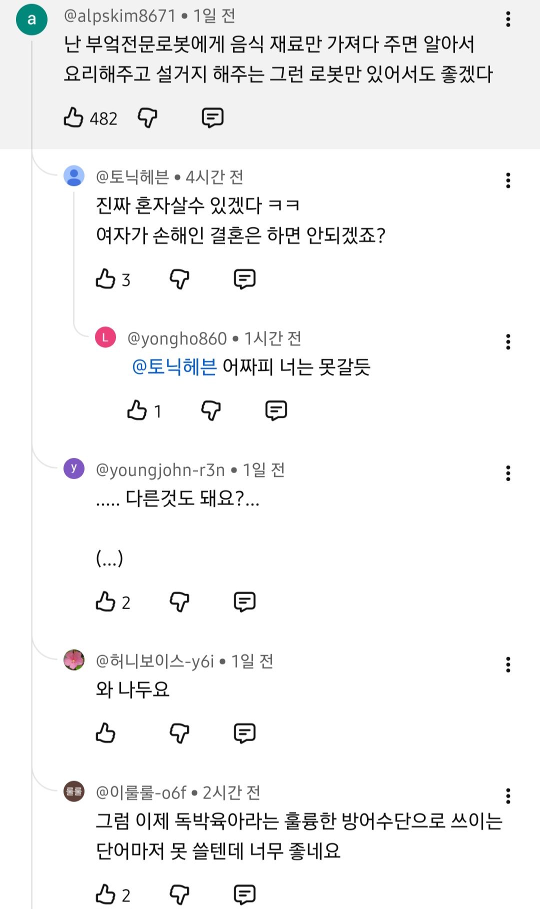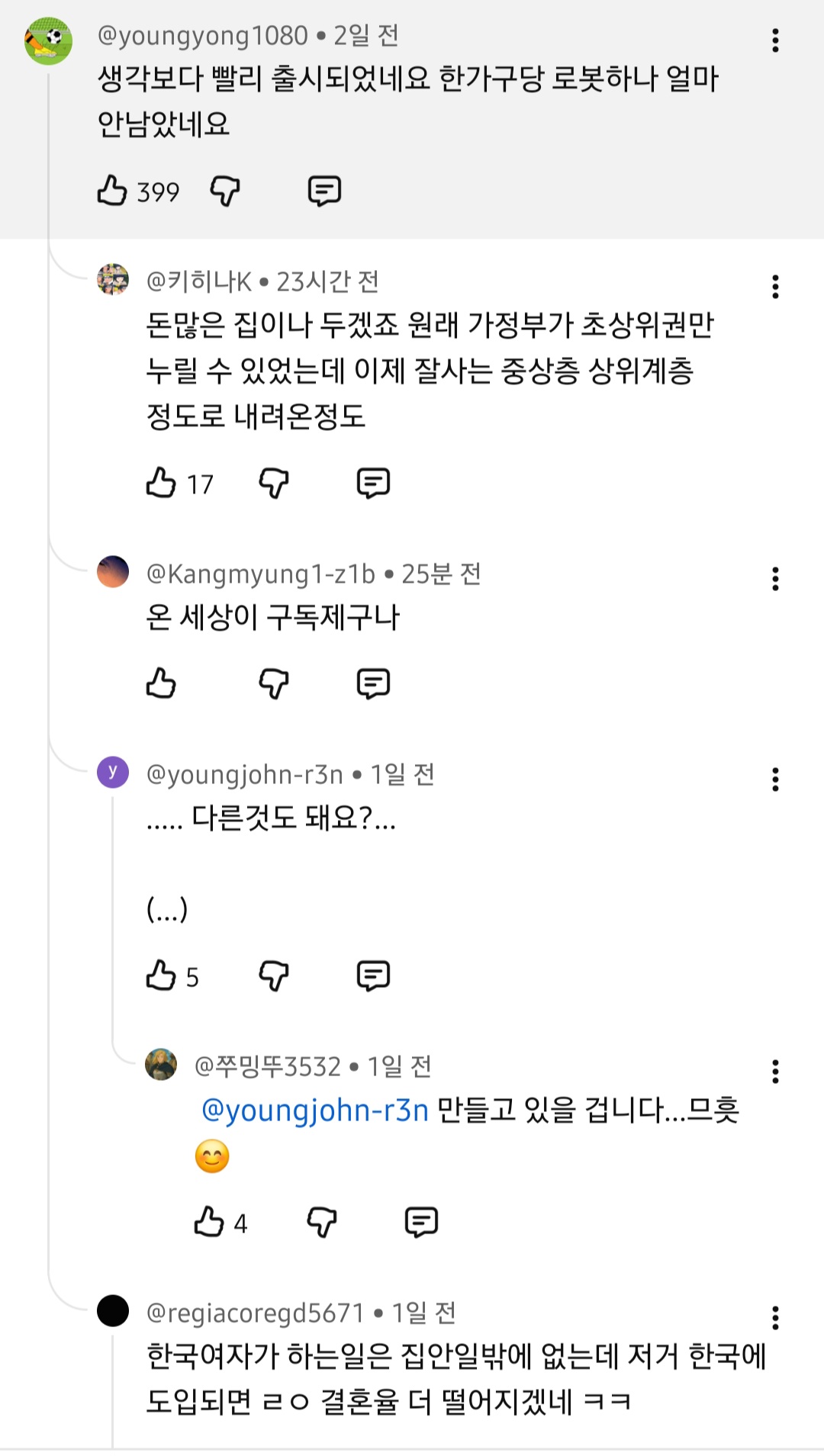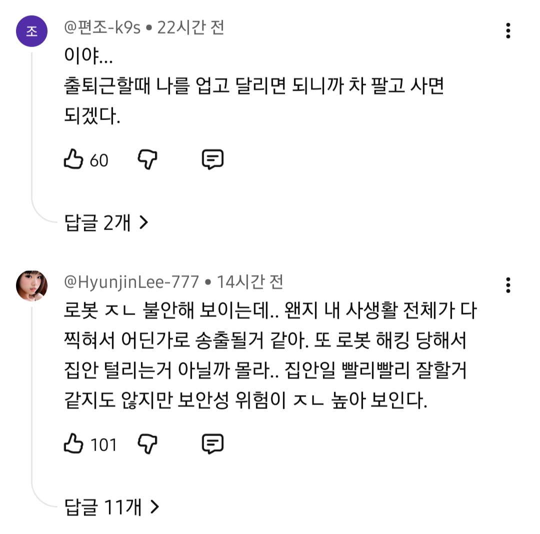 [흥미돋]월 71만원 가사도우미 로봇. jpg(댓글반응) 작성자인끼짱|작성시간25.11.05|조회수13,522 목록 댓글 45 글자크기 작게가 글자크기 크게가 출처: https://youtu.be/vzo4BMmVbyY?si=_R9LXXRdtbisS7Vo 다음검색 현재 게시글 추가 기능 열기 북마크 공유하기 신고 센터로 신고 댓글 댓글 45 댓글쓰기 답글쓰기 댓글 리스트 작성자리버스페스 | 작성시간 25.11.06 디비휴 생각나네 작성자순둥이그잡채 | 작성시간 25.11.06 나중에 반려 가정로봇 달글 생기고 서로 꾸꾸 한거 공유할듯 여시에서 ㅋㅋㅋㅋㅋㅋㅋㅋㅋㅋㅋㅋㅋㅋㅋ 작성자wiiiwii | 작성시간 25.11.06 너무 느려 성격급해서 아직 안될듯 더 개발해오거라 작성자극우울해서 극우세요? | 작성시간 25.11.06 댓글들 왜 다 자들자들함 작성자곰브리치야 내 이름 적어둬라 | 작성시간 25.11.07 오 댓글 전체보기