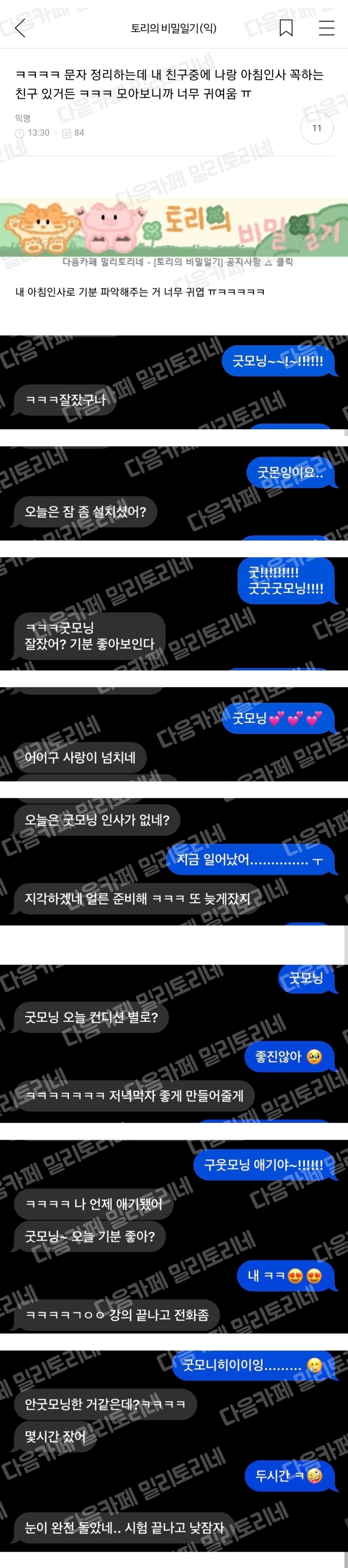 [스크랩] [흥미돋]ㅋㅋㅋㅋ 문자 정리하는데 내 친구중에 나랑 아침인사 꼭하는 친구 있거든 ㅋㅋㅋ 모아보니까 너무 귀여움 ㅠ 작성자아보카도오|작성시간25.11.05|조회수22,071 목록 댓글 25 글자크기 작게가 글자크기 크게가 출처 : https://m.cafe.daum.net/baemilytory/91cd/587554?svc=cafeapp사 궈 다음검색 스크랩 원문 : *여성시대* 차분한 20대들의 알흠다운 공간 현재 게시글 추가 기능 열기 북마크 공유하기 신고 센터로 신고 댓글 댓글 25 댓글쓰기 답글쓰기 댓글 리스트 작성자동물친구들아행복해라 | 작성시간 25.11.06 사궈 작성자정신또렷증 | 작성시간 25.11.06 사랑이다,,, 작성자아너무배고파ㅜ | 작성시간 25.11.06 와 너무 다정해... 작성자뚱땅뚱땡 | 작성시간 25.11.06 귀엽고 다정해 작성자모죠의 일기 | 작성시간 25.11.06 사랑인데 댓글 전체보기