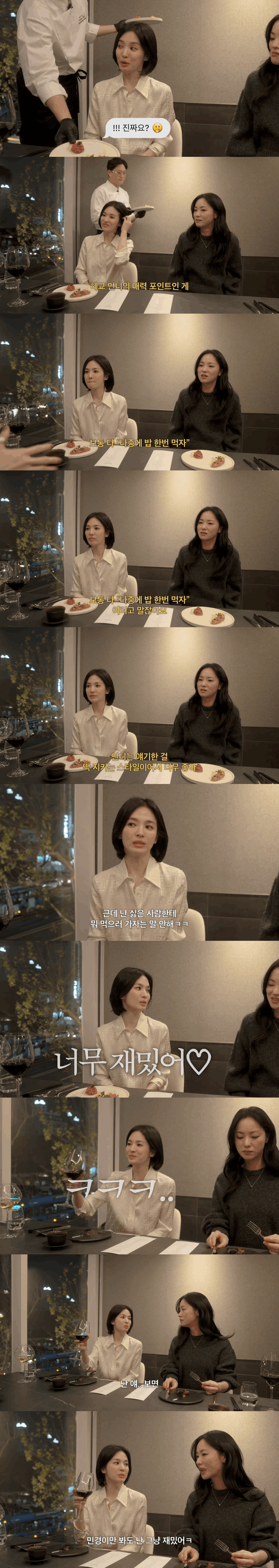 작성자대충썬글라스쓴이모티콘 작성시간 25.11.06 아니 둘 다 성격이 너무 좋아보여.. 강민경은 애살있고 언니들한테 잘 하는게 보이고, 송혜교는 신비주의였어서 도도하실줄 알았는데 진짜 시원시원하고 의리있는 성격이더라.. 여자로서 진짜 본받고싶은 성격임..