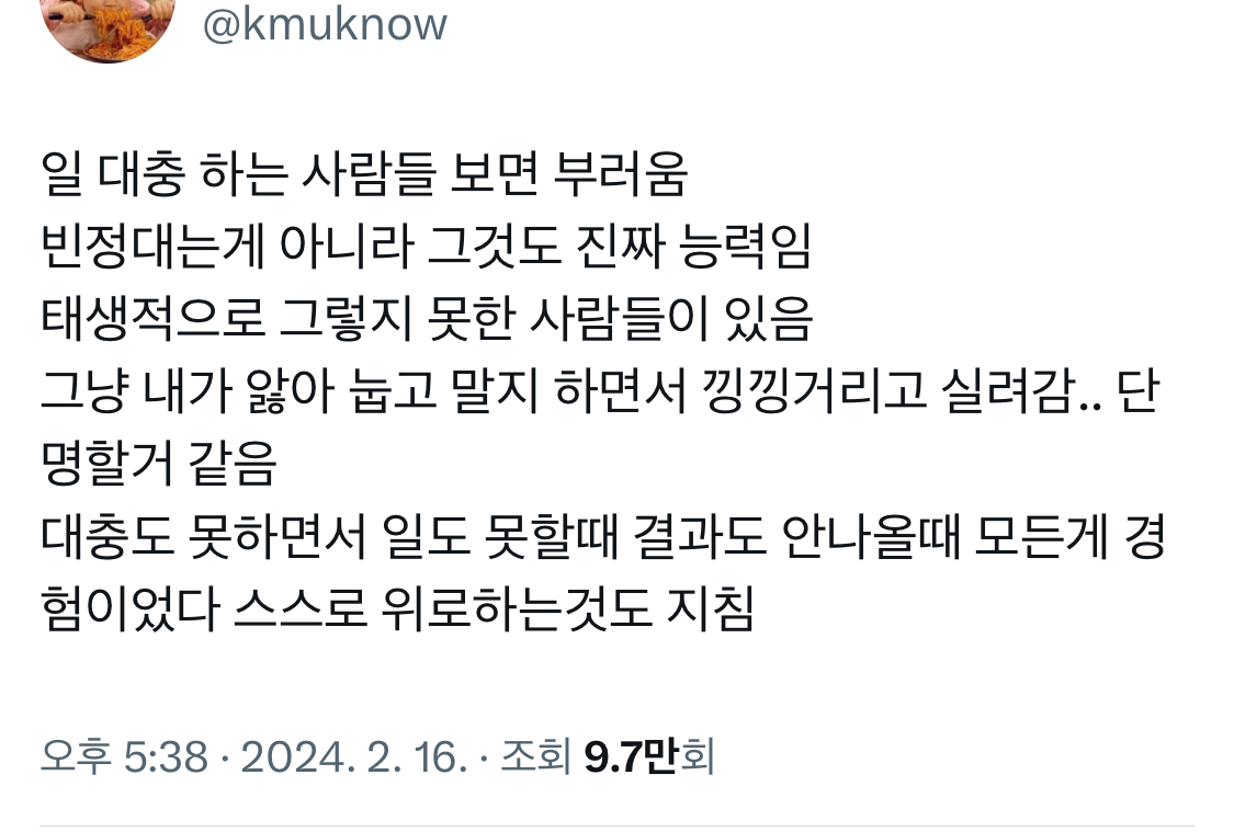 작성자대원지시대 작성시간 25.11.06 매일 야근하는 동료 있던데 요령이 없는 것 같음