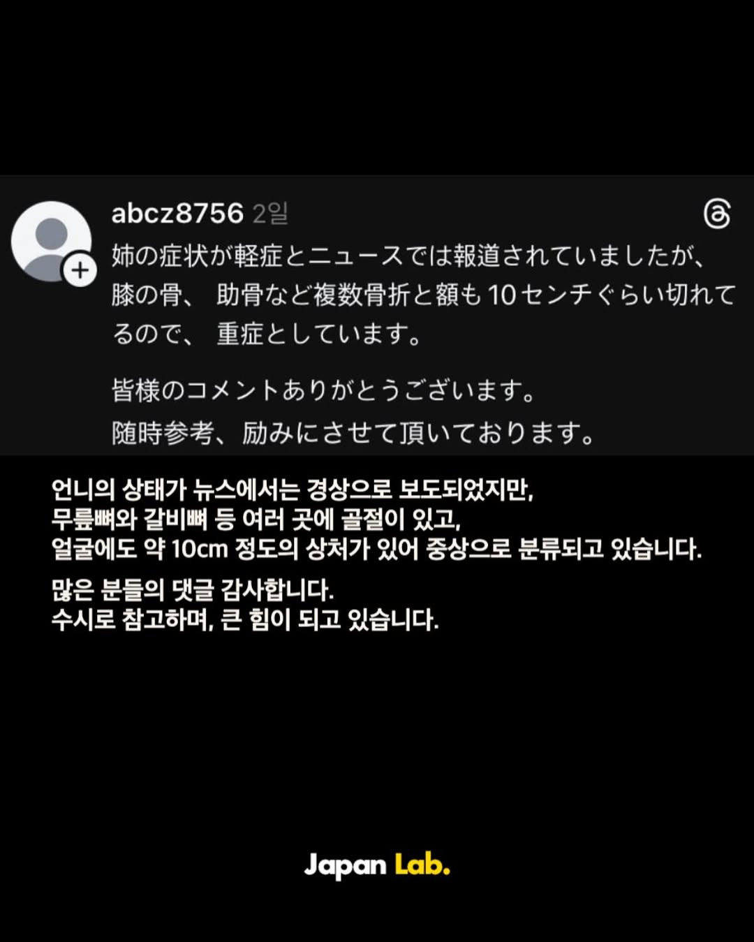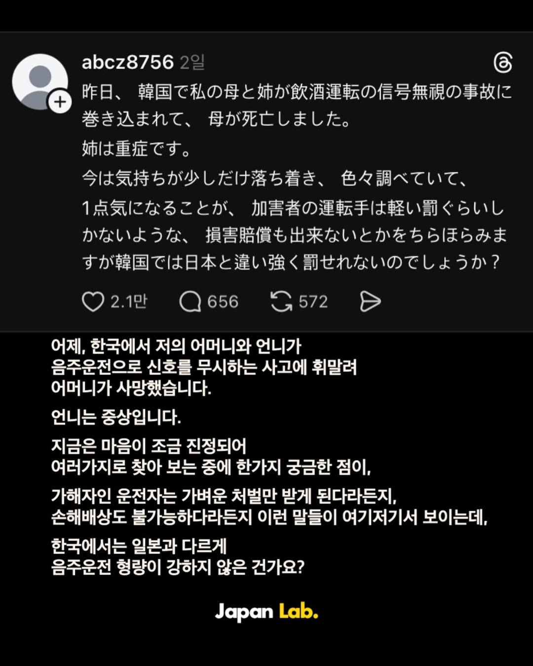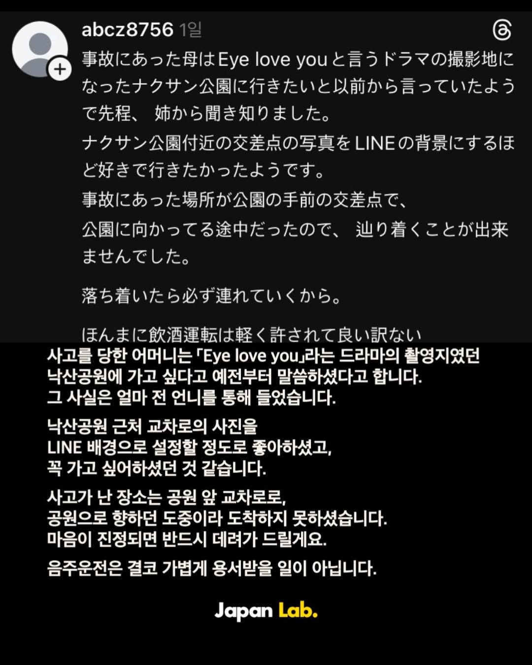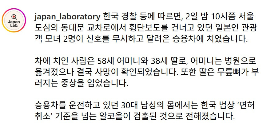 [기타]한국에서 음주운전 때문에 사망한 일본인 가족이 올린 글.jpg 작성자본인닉넴|작성시간25.11.06|조회수56,335 목록 댓글 247 글자크기 작게가 글자크기 크게가 출처: https://theqoo.net/square/3981029268 다음검색 현재 게시글 추가 기능 열기 북마크 공유하기 신고 센터로 신고 댓글 댓글 247 댓글쓰기 답글쓰기 댓글 리스트 작성자나를살게하는것 | 작성시간 25.11.08 아 너무 부끄럽고 죄송하다ㅠㅠㅠㅠㅠ 작성자낚시왕유시민 | 작성시간 25.11.08 절대 못떼게 차 내부에 음주측정기를 달아라 ㅡㅡ 작성자이미지리 | 작성시간 25.11.08 너무마음아프다ㅜㅜㅜ 작성자Amoroso | 작성시간 25.11.08 참 안타까워… 무슨 죄야 돌아가신 분이랑 다친 분은 작성자무토바금지! | 작성시간 25.11.12 맘아프다... 한국이 좋아서 오셨던걸텐데 댓글 전체보기