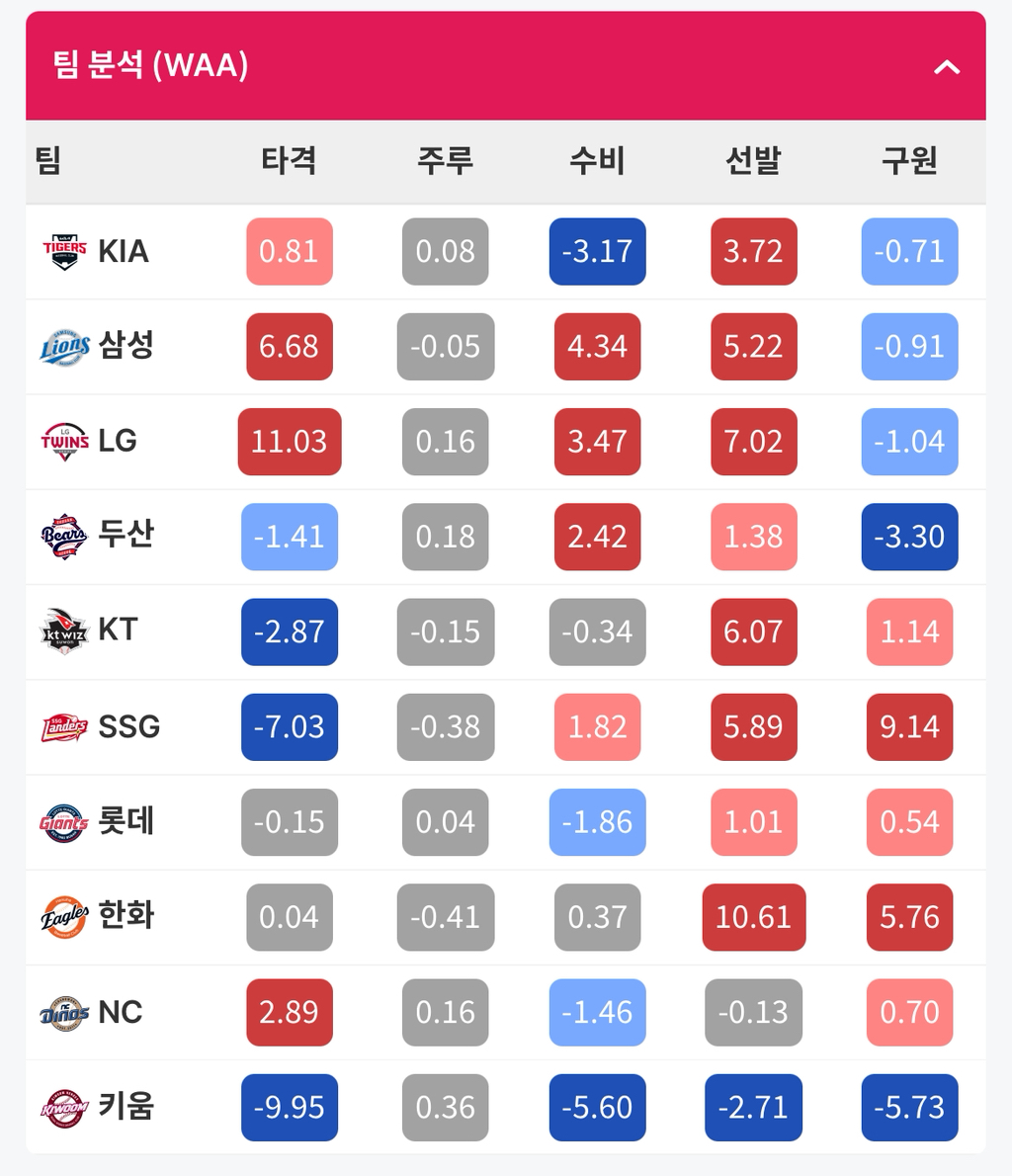 [흥미돋][야구] 2025시즌 팀 분석(WAA) 지표 작성자죄송합니다겠냐고|작성시간25.11.06|조회수5,223 목록 댓글 18 글자크기 작게가 글자크기 크게가 출처: 여성시대 죄송합니다겠냐고숫자가 높으면 높을수록 좋은거!최종지표인데본인의 체감과 비슷하신가요,, 다음검색 현재 게시글 추가 기능 열기 북마크 공유하기 신고 센터로 신고 댓글 댓글 18 댓글쓰기 답글쓰기 댓글 리스트 작성자안다은 | 작성시간 25.11.07 투수들만 야구했네 작성자헤이 걸 | 작성시간 25.11.07 엘지 타격 넘 무서웠으.... 작성자할게없슈 | 작성시간 25.11.07 투수만 야구 했어 작성자연금복권700당첨기원 | 작성시간 25.11.08 투수만 야구 하네 ..그니까 1점을 못내면 진다니꺼 야구는ㅡㅡ? 빠따들아 작성자랄로 폴프로렌 | 작성시간 25.11.08 주루 ㅋ 댓글 전체보기