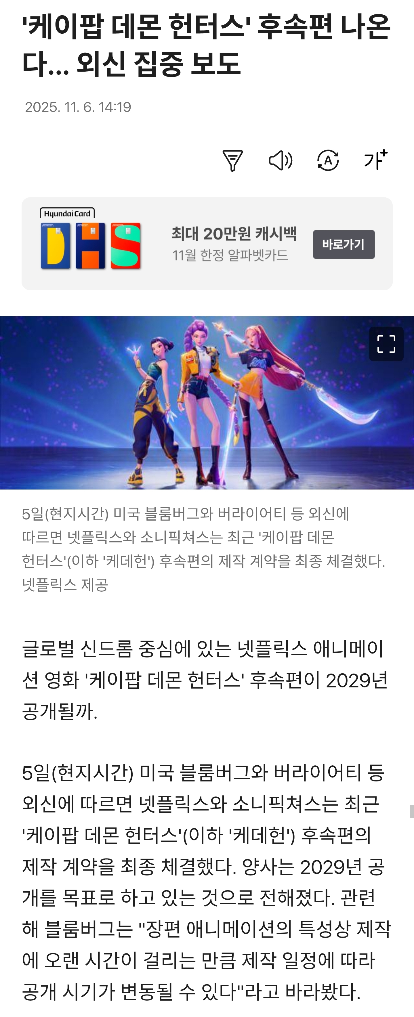[여시뉴스데스크]'케이팝 데몬 헌터스' 후속편 나온다… 외신 집중 보도 작성자하늘땅별땅땅땅땅|작성시간25.11.07|조회수7,402 목록 댓글 13 글자크기 작게가 글자크기 크게가 출처: '케이팝 데몬 헌터스' 후속편 나온다… 외신 집중 보도 https://share.google/vWmn0TWkYiNdLNfAR'케이팝 데몬 헌터스' 후속편 나온다… 외신 집중 보도글로벌 신드롬 중심에 있는 넷플릭스 애니메이션 영화 '케이팝 데몬 헌터스' 후속편이 2029년 공개될까. 5일(현지시간) 미국 블룸버그와 버라이어티 등 외신에 따르면 넷플릭스와 소니픽쳐스는 v.daum.net 다음검색 현재 게시글 추가 기능 열기 북마크 공유하기 신고 센터로 신고 댓글 댓글 13 댓글쓰기 답글쓰기 댓글 리스트 작성자회색의무민 | 작성시간 25.11.07 제작진들 다 퇴사했다고 한거같았는데다시 그사람들이 하나?? 답댓글 작성자줄게줄게한남다줄게 | 작성시간 25.11.07 다 퇴사는 아니고 일부 부서 일부 팀만임 작성자재맹이 | 작성시간 25.11.07 기다릴게여 작성자닥터닥터 | 작성시간 25.11.07 4년밖에 안걸린다고???얌전히 기다릴게요 작성자냉면사리 | 작성시간 25.11.07 재밌겠다 댓글 전체보기