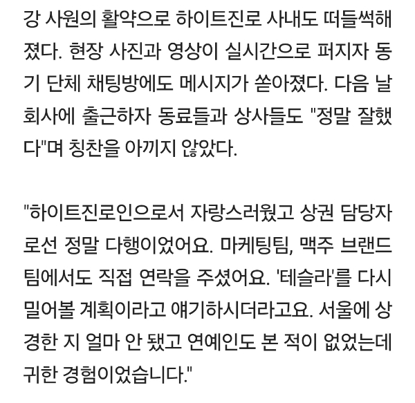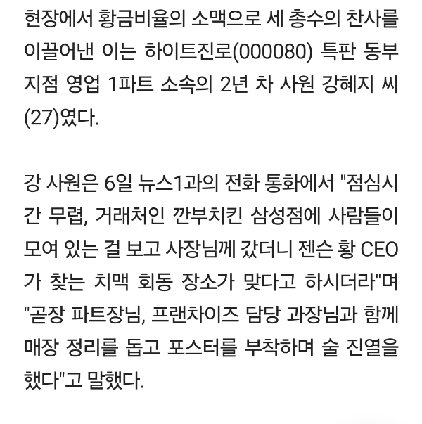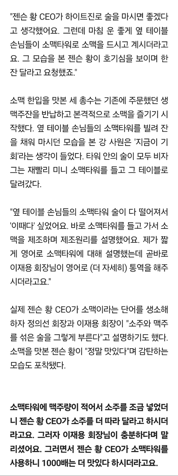 [여시뉴스데스크]"젠슨황 소맥, 제가 말았죠"…Z세대 패기로 탄생한 '총수 러브샷' 작성자이제추버요|작성시간25.11.07|조회수9,572 목록 댓글 51 글자크기 작게가 글자크기 크게가 출처: 여성시대 (이제추버요)https://m.news.nate.com/view/20251107n03198 다음검색 현재 게시글 추가 기능 열기 북마크 공유하기 신고 센터로 신고 댓글 댓글 51 댓글쓰기 답글쓰기 댓글 리스트 작성자닼앝 | 작성시간 25.11.07 크으 진짜 멋잇다 작성자북장수 | 작성시간 25.11.07 야 순발력미쳣다 작성자사과들 | 작성시간 25.11.07 진급 시켜‼️‼️ 작성자4루수 | 작성시간 25.11.07 혜지씨 특진시켜~~~ 작성자낼은 햄버거 먹어야지 | 작성시간 25.11.07 진짜 멋지다 승승장구하실듯 댓글 전체보기