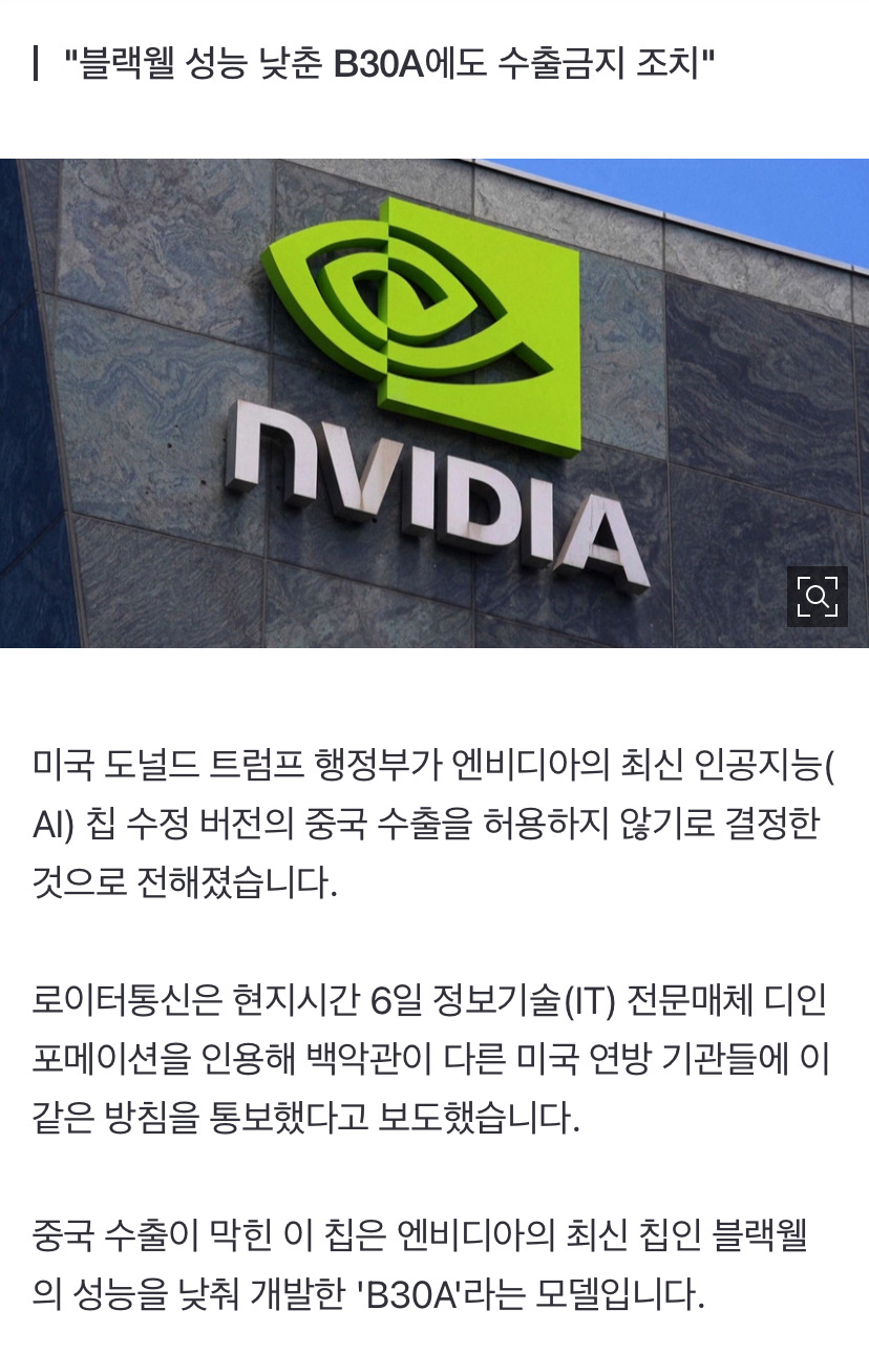 [여시뉴스데스크]엔비디아, 어쩌나? "저사양 AI칩도 中 수출 불허" 작성자Eyeeepiee|작성시간25.11.07|조회수6,571 목록 댓글 28 글자크기 작게가 글자크기 크게가 출처: https://n.news.naver.com/article/374/0000473521?sid=104 다음검색 현재 게시글 추가 기능 열기 북마크 공유하기 신고 센터로 신고 댓글 댓글 28 댓글쓰기 답글쓰기 댓글 리스트 작성자사천짜장맛 | 작성시간 25.11.07 우리줘 우리줘 작성자내 꿈은 돈 많은 백수 | 작성시간 25.11.07 우리줘 작성자에리애비 | 작성시간 25.11.07 우리줘 작성자누룽지사탕(업소용) | 작성시간 25.11.07 감사합니다 작성자김치프라이스 | 작성시간 25.11.07 우리도 좃본이 불소? 이거 수출 안한다고해서 빡쳐서 개발햇자나.. 수출 안하면 중국이 가만히 잇겟냐 댓글 전체보기