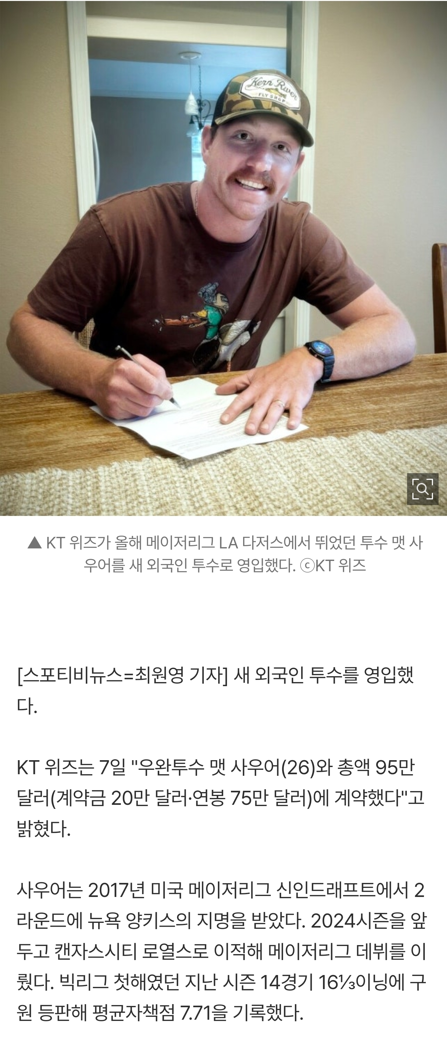 [여시뉴스데스크][프로야구] KT, '다저스 투수' 영입! 맷 사우어와 95만 달러 계약…"선발 경험 풍부한 구위형 투수" 작성자푸른파도_BlueWave|작성시간25.11.07|조회수4,462 목록 댓글 18 글자크기 작게가 글자크기 크게가 출처: https://naver.me/59UWBp0NKT, '다저스 투수' 영입! 맷 사우어와 95만 달러 계약…"선발 경험 풍부한 구위형 투수"여기를 눌러 링크를 확인하세요m.sports.naver.com..전문출처 다음검색 현재 게시글 추가 기능 열기 북마크 공유하기 신고 센터로 신고 댓글 댓글 18 댓글쓰기 답글쓰기 댓글 리스트 작성자안겹치는닉네임뭔데 | 작성시간 25.11.07 야구는 원래 벌써 용병 계약해…? 작성자수박juicy | 작성시간 25.11.07 99요.??? 작성자.........더보기 | 작성시간 25.11.07 99??? 뻥치지마 50살이잖아! 작성자오맹달 | 작성시간 25.11.07 너누군데 작성자아난다 | 작성시간 25.11.07 와 벌써?? 댓글 전체보기