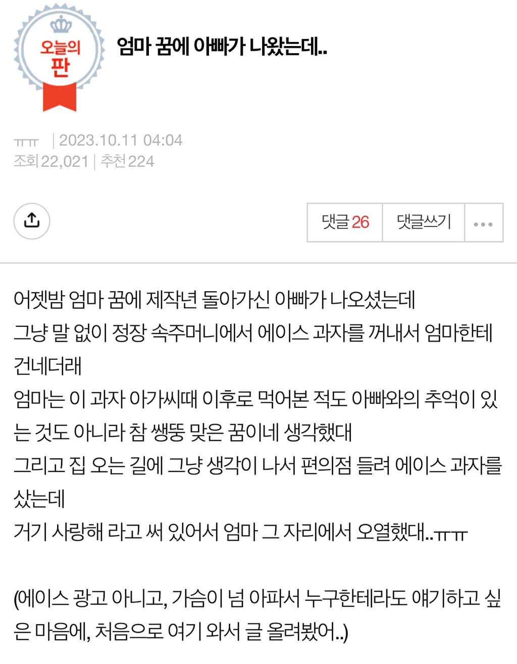 [스크랩] [눈물한방울]엄마 꿈에 아빠가 나왔는데.. 작성자하말이넘많이|작성시간25.11.07|조회수38,163 목록 댓글 44 글자크기 작게가 글자크기 크게가 출처: https://m.pann.nate.com/talk/371164846 다음검색 스크랩 원문 : *여성시대* 차분한 20대들의 알흠다운 공간 현재 게시글 추가 기능 열기 북마크 공유하기 신고 센터로 신고 댓글 댓글 44 댓글쓰기 답글쓰기 댓글 리스트 작성자왓두유두유 | 작성시간 25.11.07 이런 우연이 어떻게 ㅠㅠㅠㅠㅠ 작성자여기로오개 | 작성시간 25.11.07 ㅠㅠ 작성자재즈처돌이 | 작성시간 25.11.07 ㅠㅠㅠ 작성자월화술먹굼토웩 | 작성시간 25.11.07 나라면 안먹고 평생 간직함.. ㅎㅎ 작성자허광한(36) | 작성시간 25.11.08 광광울어 댓글 전체보기