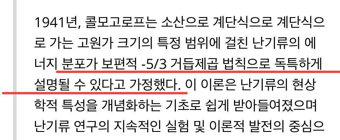 난류는 큰 소용돌이가 작은 소용돌이로 쪼개질 때 에너지가 정해진 비율로 줄어드는데, 그 비율을 그래프로 보면 기울기가 −5/3이 된다. 이게 바로 난류의 대표적인 법칙.