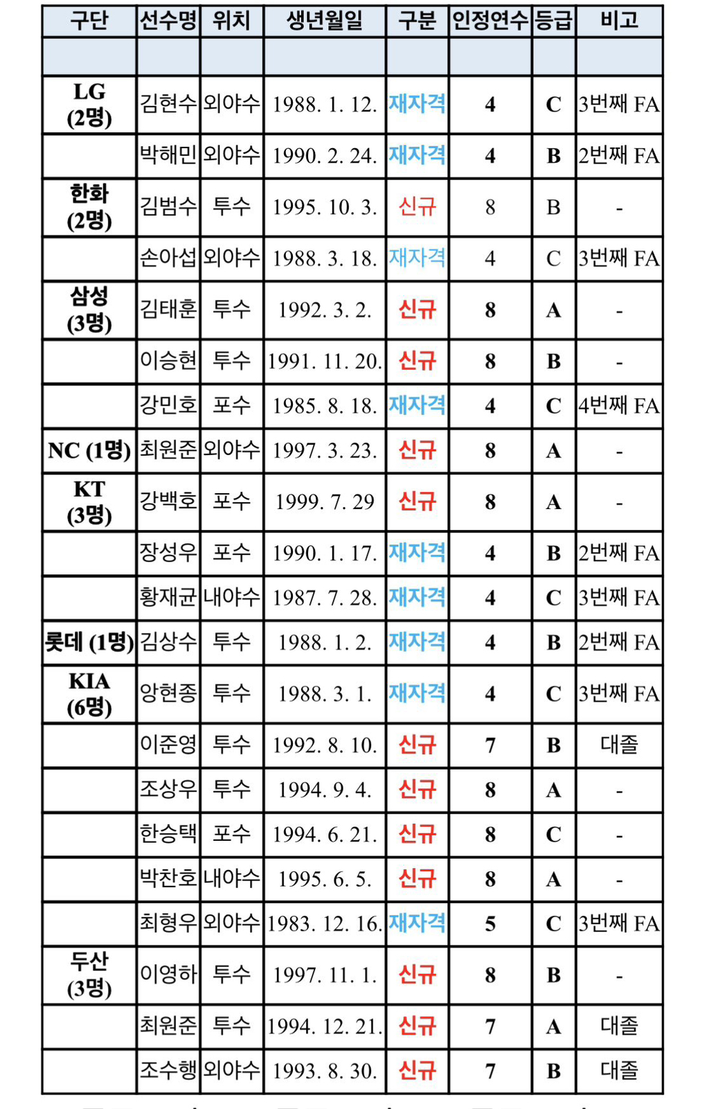 2026년 FA 승인 선수는 LG 김현수, 박해민, 한화 김범수, 손아섭, 삼성 김태훈, 이승현, 강민호, NC 최원준, KT 강백호, 장성우, 황재균, 롯데 김상수, KIA 양현종, 이준영, 조상우, 한승택, 박찬호, 최형우, 두산 이영하, 최원준, 조수행 등 총 21명이다.