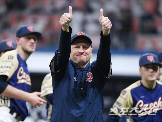 9일 서울 고척스카이돔에서 열린 한국과 체코의 야구대표팀 평가전에서 한국이 11대1로 승리했다. 체코 하딤 감독이 응원을 보내 준 팬들을 향해 엄지를 들고 있다. 고척=정재근 기자