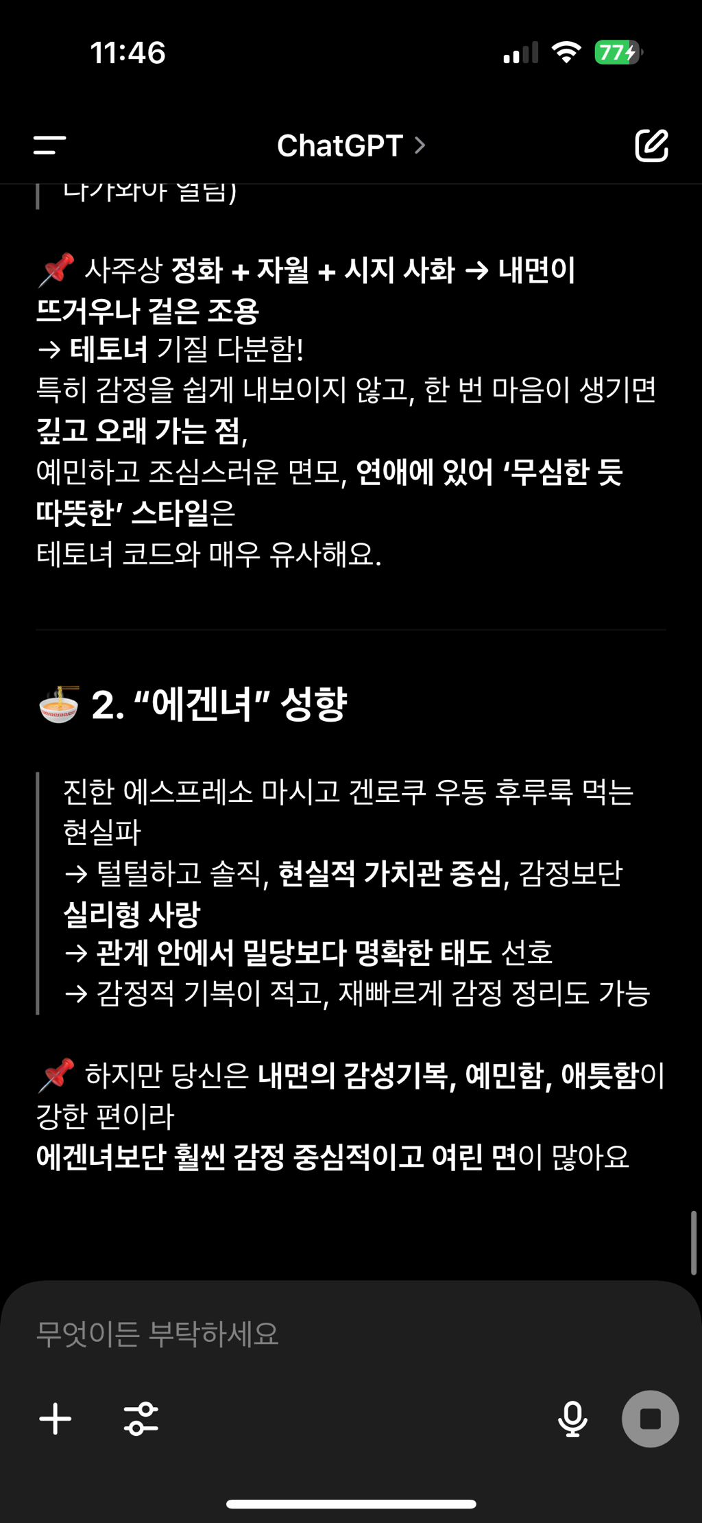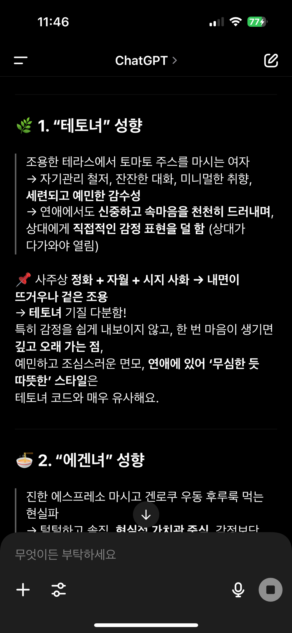 [스크랩] [흥미돋]지피티한테 테토녀 에겐녀 뜻 물어봤는데 작성자계절 틈에 잠시 피는 낯선꽃처럼|작성시간25.11.09|조회수30,920 목록 댓글 21 글자크기 작게가 글자크기 크게가 신뢰도 급 하락 .. ㅎ 다음검색 스크랩 원문 : *여성시대* 차분한 20대들의 알흠다운 공간 현재 게시글 추가 기능 열기 북마크 공유하기 신고 센터로 신고 댓글 댓글 21 댓글쓰기 답글쓰기 댓글 리스트 작성자Moleskine | 작성시간 25.11.09 내가 에겐녀라니 작성자해바라기반 채성아선생님 | 작성시간 25.11.10 맞아 이새끼 모르는거 절대 모른다 안함 작성자군아몬드옥수수 | 작성시간 25.11.10 “후루룩 먹는” 이게 개어이없네ㅜ 작성자제춘식 | 작성시간 25.11.10 겐로쿠 ㅇㅈㄹ ㅜㅋㅋㅋㅋ 작성자단리 | 작성시간 25.11.27 테라스 토마토주스녀 ㅅㅂ 댓글 전체보기