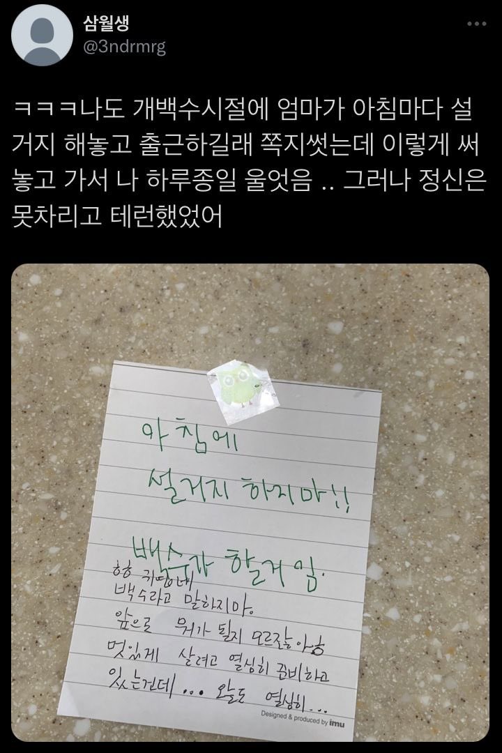 [스크랩] [흥미돋]백수시절 엄마가 아침마다 설거지 해놓고 출근하길래 쪽지썻는데.x 작성자열빙어|작성시간25.11.09|조회수109,606 목록 댓글 23 글자크기 작게가 글자크기 크게가 출처:https://x.com/dakggi/status/1969767980038083019?t=XIqo3QEfyEVY77AKLh--2A&s=19🥹 다음검색 스크랩 원문 : *여성시대* 차분한 20대들의 알흠다운 공간 현재 게시글 추가 기능 열기 북마크 공유하기 신고 센터로 신고 댓글 댓글 23 댓글쓰기 답글쓰기 댓글 리스트 작성자카페탐방하고싶은사람 | 작성시간 25.11.10 작성자소붕이 | 작성시간 25.11.10 너무 귀엽다 ㅜㅜㅜ 어머니도 너무 따수워,, 그와중에 듀오링고 스티커인건가 작성자이킁에킁 | 작성시간 25.11.10 엄마ㅜㅠㅠㅠㅜ 작성자겨울언제옴 | 작성시간 25.11.10 테런ㅋㅋㅋㅋㅋㅋㅋㅋㅋ 작성자날마다새로운날 | 작성시간 25.11.10 댓글 전체보기