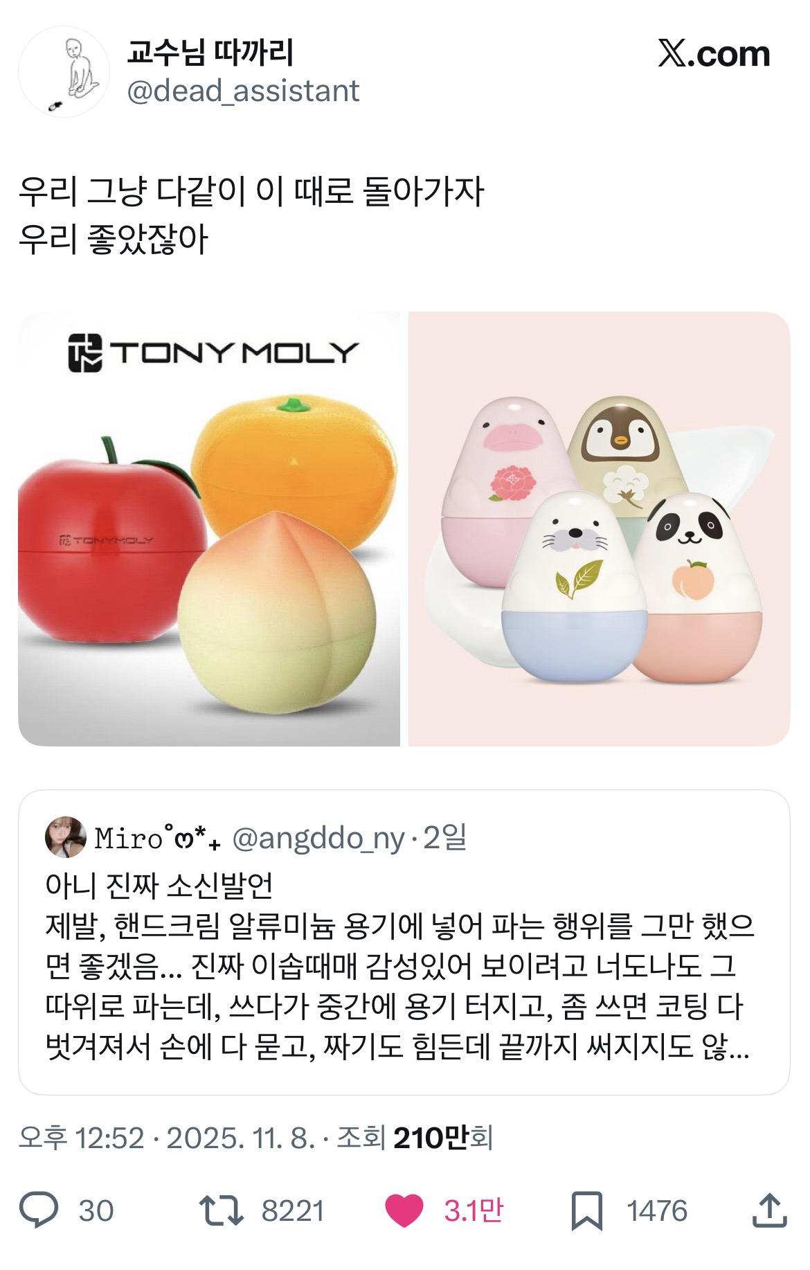 작성자존슨즈라라 작성시간 25.11.10 근데 어떤 유튜버가 저 사과랑 .. 핸드크림 소개하더라 다시 나왔나봐 홍보는 아니겠지...?