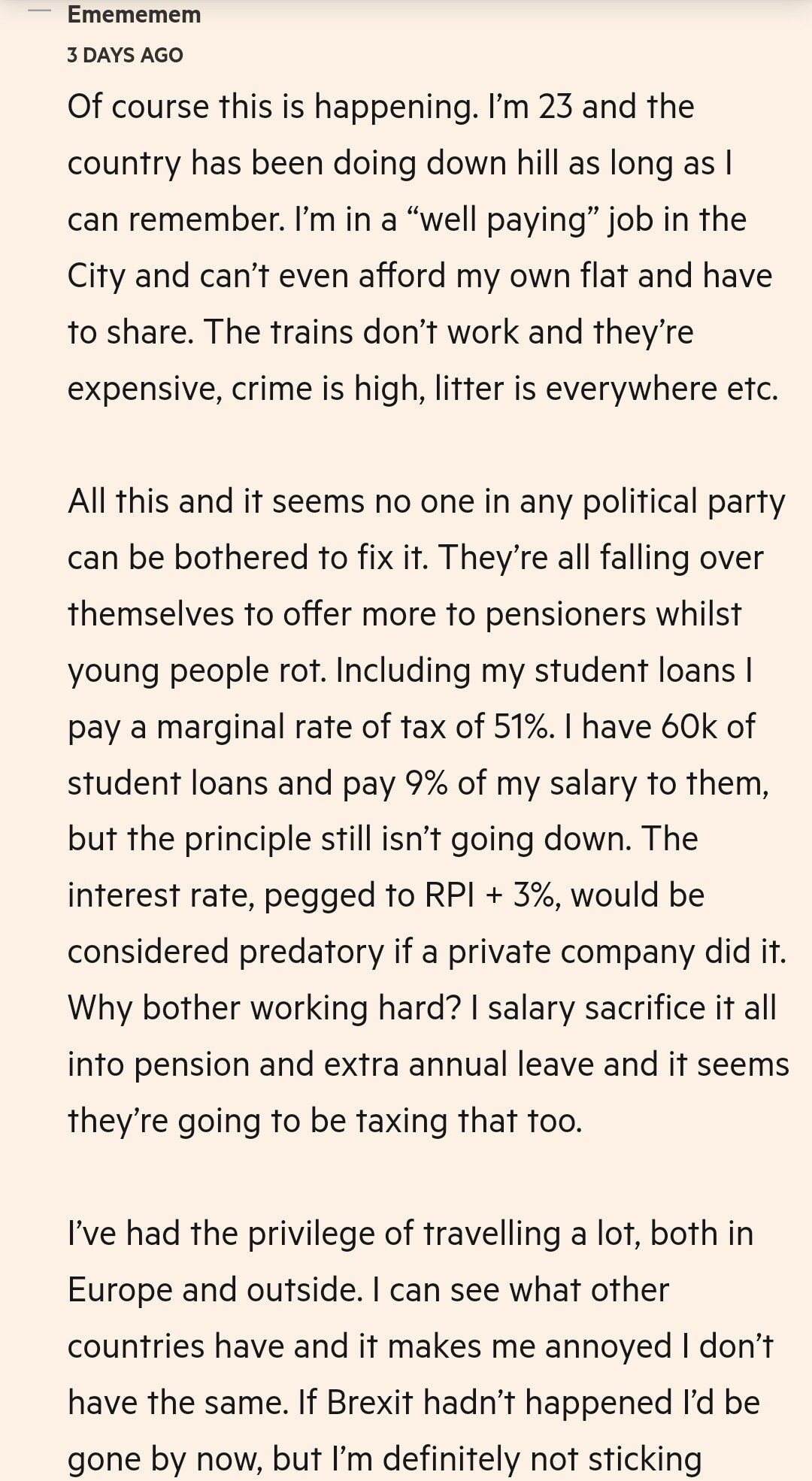 그런데 보수건 진보건 정치인들은 아무도 이 문제를 해결하지 않으려 하며 젊은 청년들이 개고생할때 연금 생활자들에게 연금만 더 퍼줄려고 한다고 분노. 현재 학자금 대출까지 해서 버는 돈의 약 51% 가 세금으로 내는중인데 대출 원금은 내려가지 않는다고. 그렇기에 다음 선거때까지 기다리지 않고 영국에서 떠날 작정이라고 얘기.
