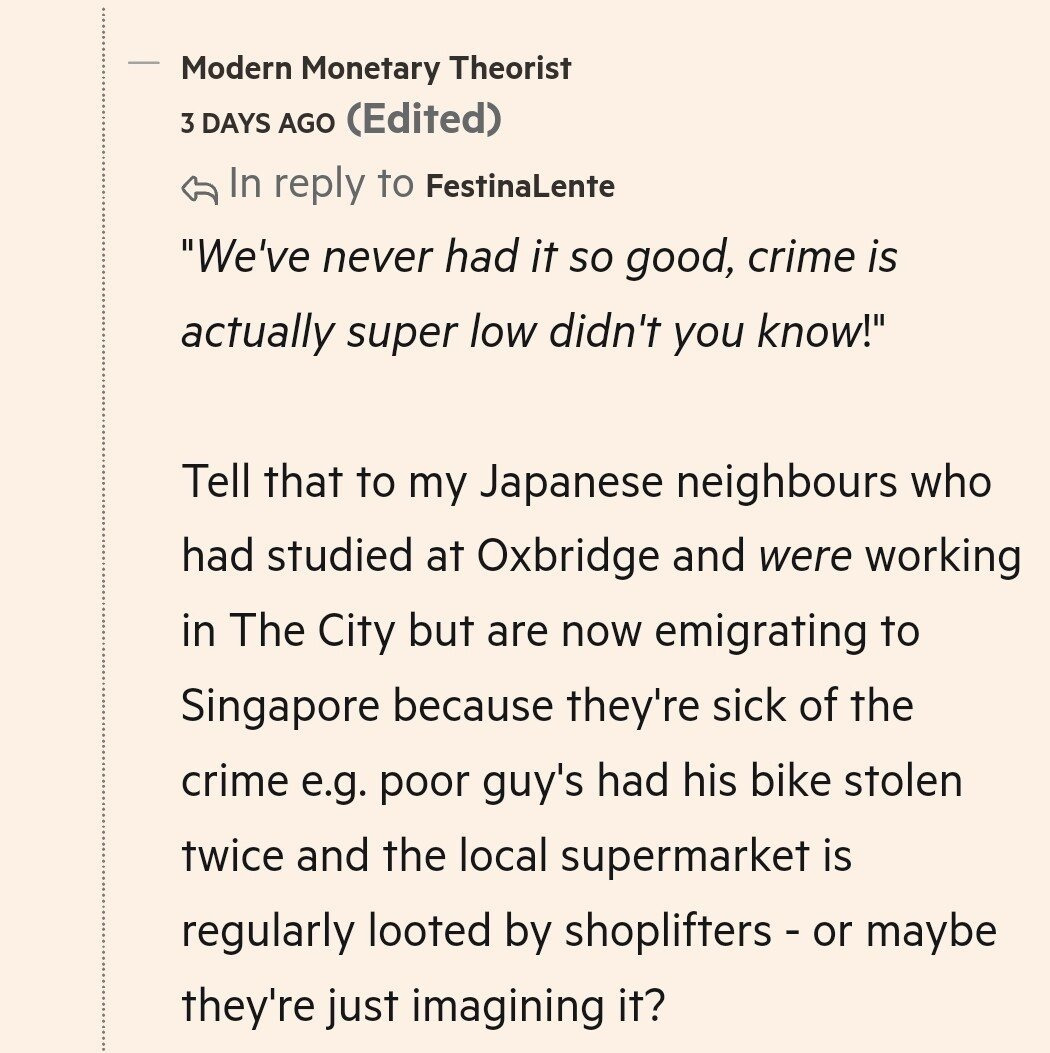 옥스포드- 케임브리지 대학에서 졸업해 시티 오브 런던에서 일하던 고소득 금융직종 일본인이 자전거를 털어가고 슈퍼마켓이 약탈당하는 상황에 질려서 싱가포르로 이민 간다는 댓글.