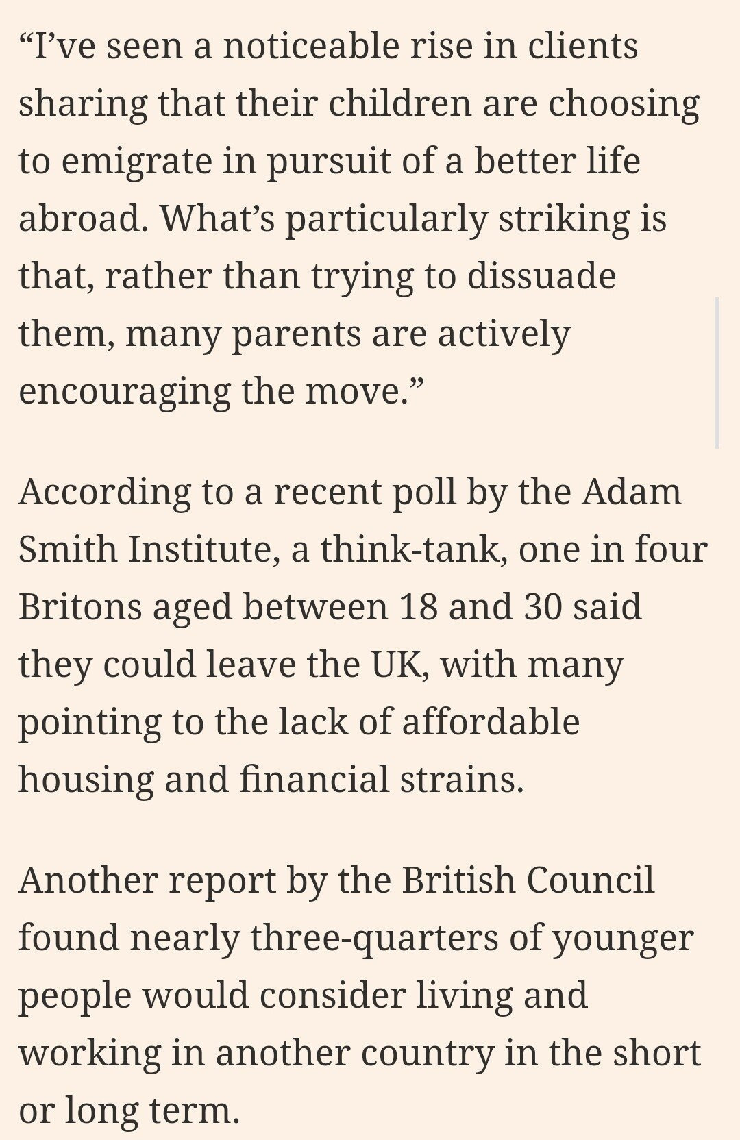 이에 더해 영국 부모들은 영국에서 기회가 더 많은곳으로 떠나는것을 말리거나 재고해보라고 하기는 커녕 오히려 적극 권장중에 있다고 함.