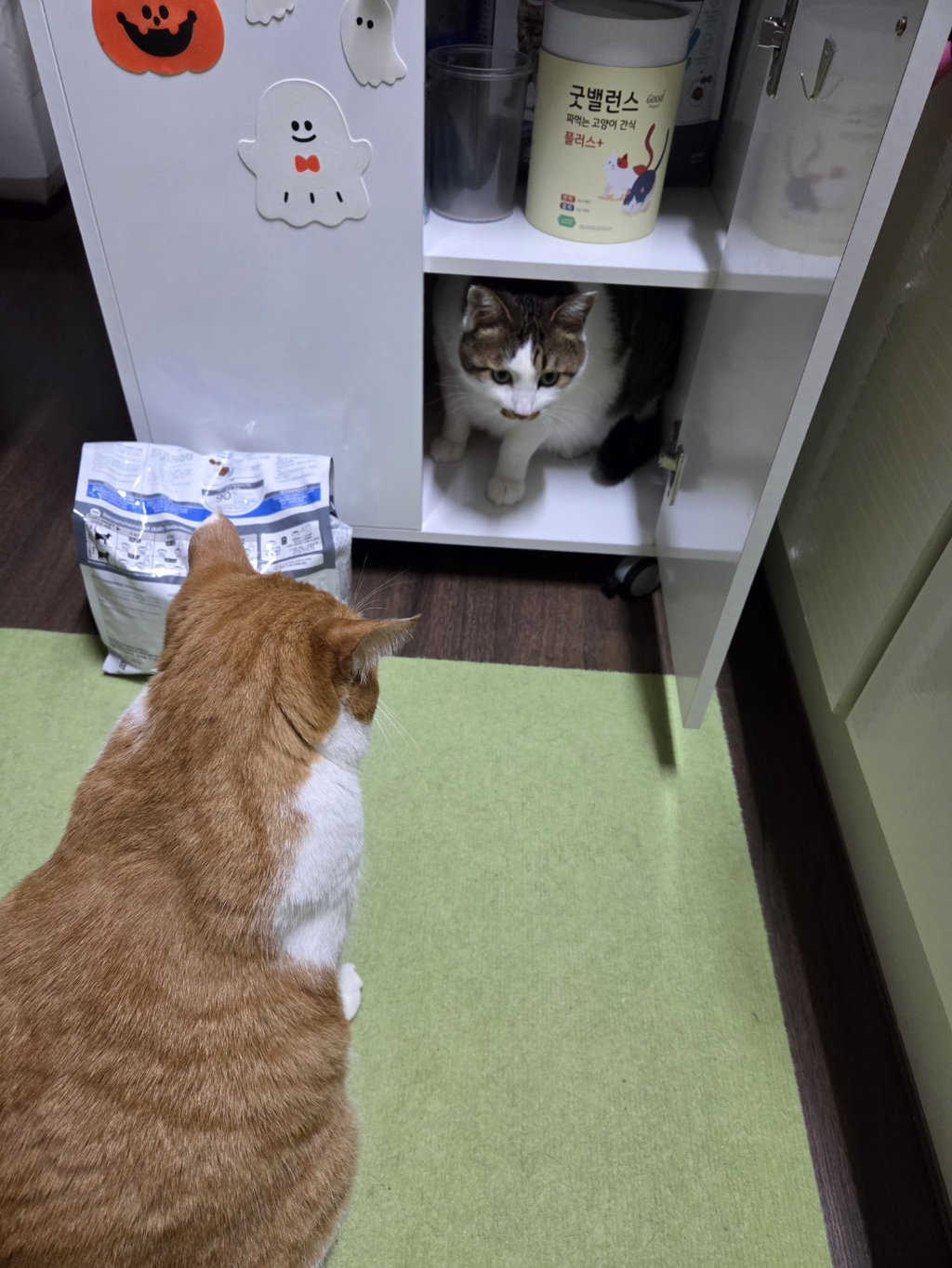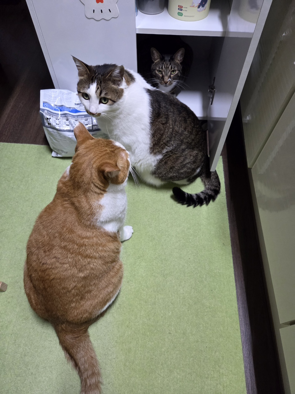 그냥 거실에서 간식주면 서로먹겠다고 고개들이밀기 때문에 저 서랍에 한마리가 들어가있으면 윗서랍에서 꺼내서 한마리씩 주는 규칙을 만들어서 훈련시켰다