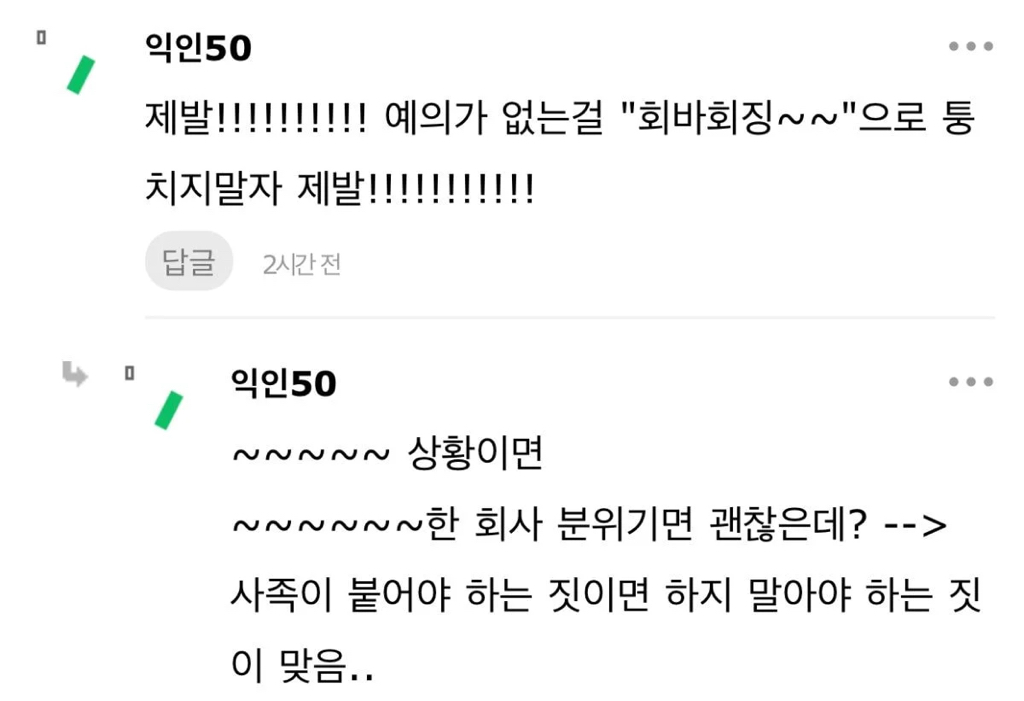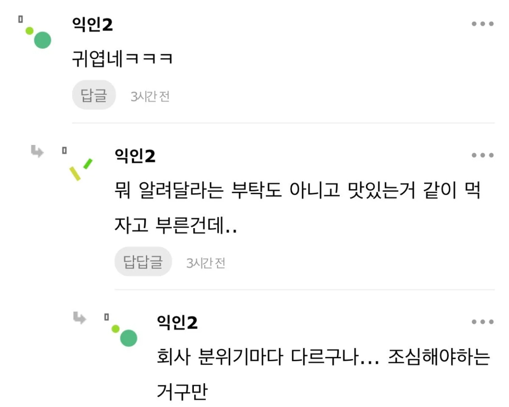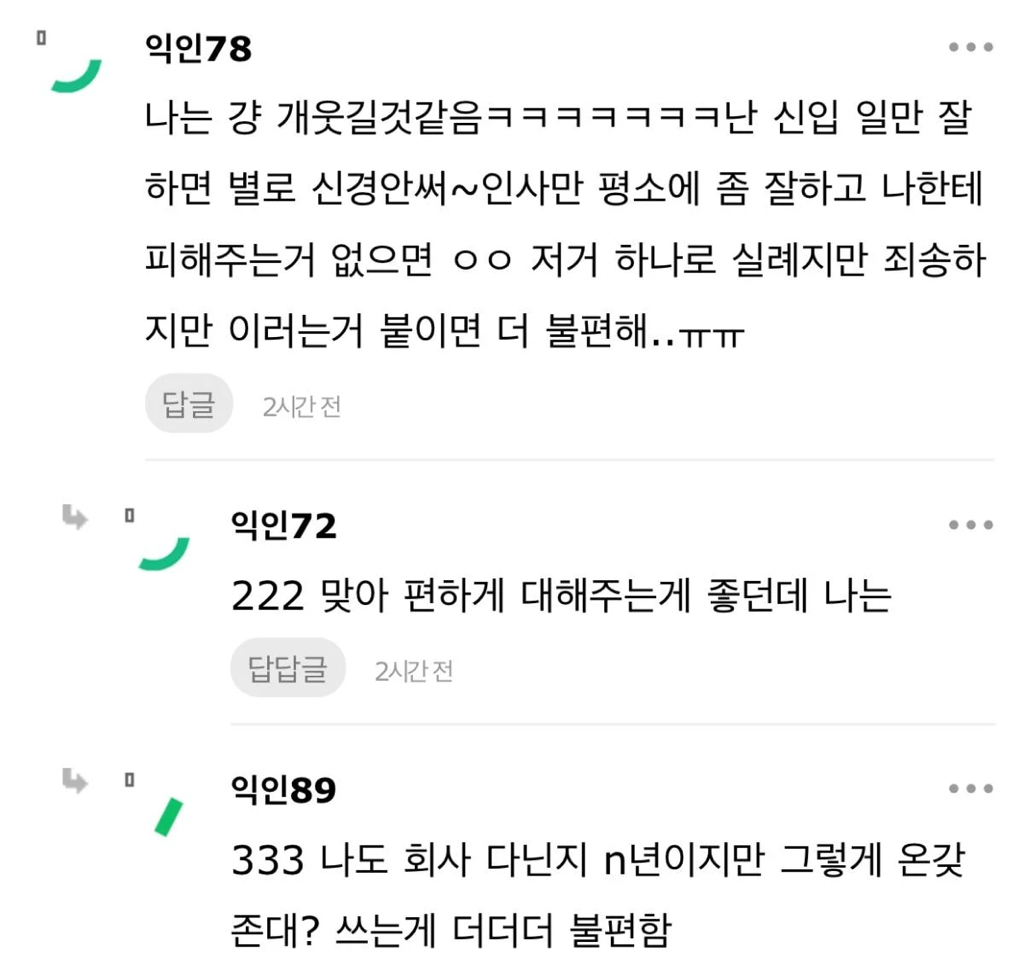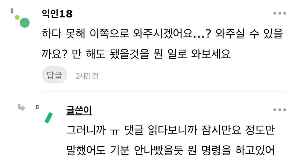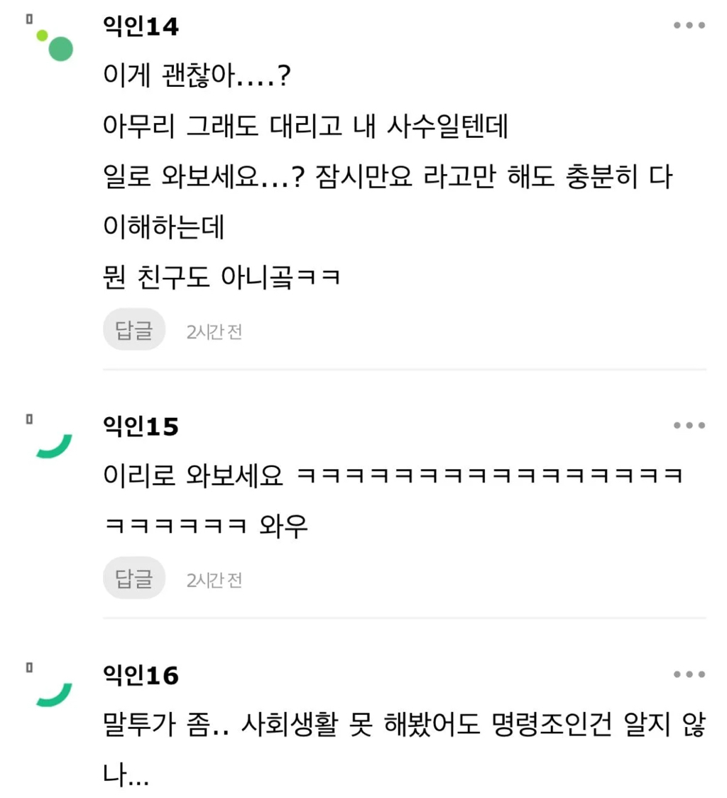작성자매드키위새 작성시간 25.11.13 나쁜의도 아니잖아 괜찮아 일더럽게 못하면서 저런말투면 개싫겠지만..