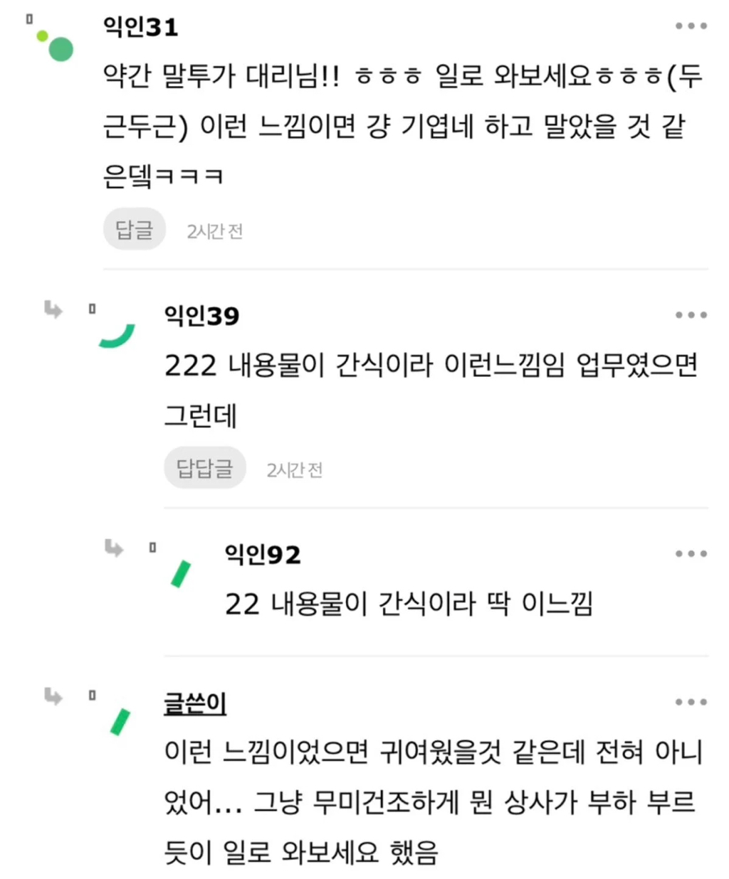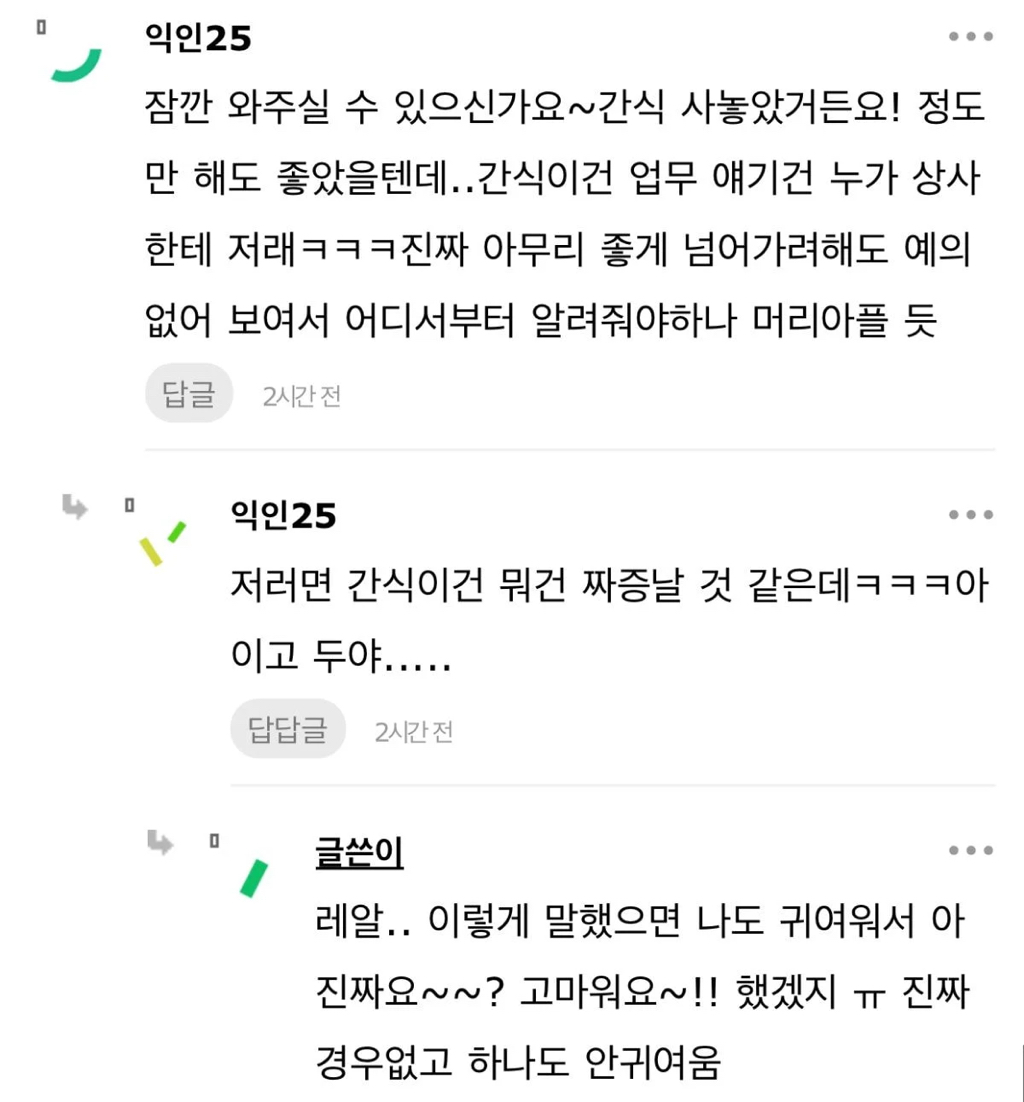 작성자앙용하세용 작성시간 25.11.13 일적인거면 모르겠는데 간식주려고 한거면 이미 표정이나 제스쳐, 말투가