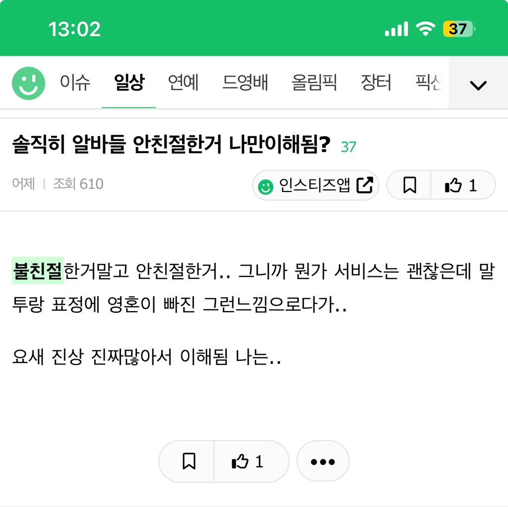 작성자감감한밤에 가만가만히 작성시간 25.11.13 최저에맞게 가는거지뭐 아니 물건 이나 그런거 사러간거지 친절받으려고 간거아니잖음