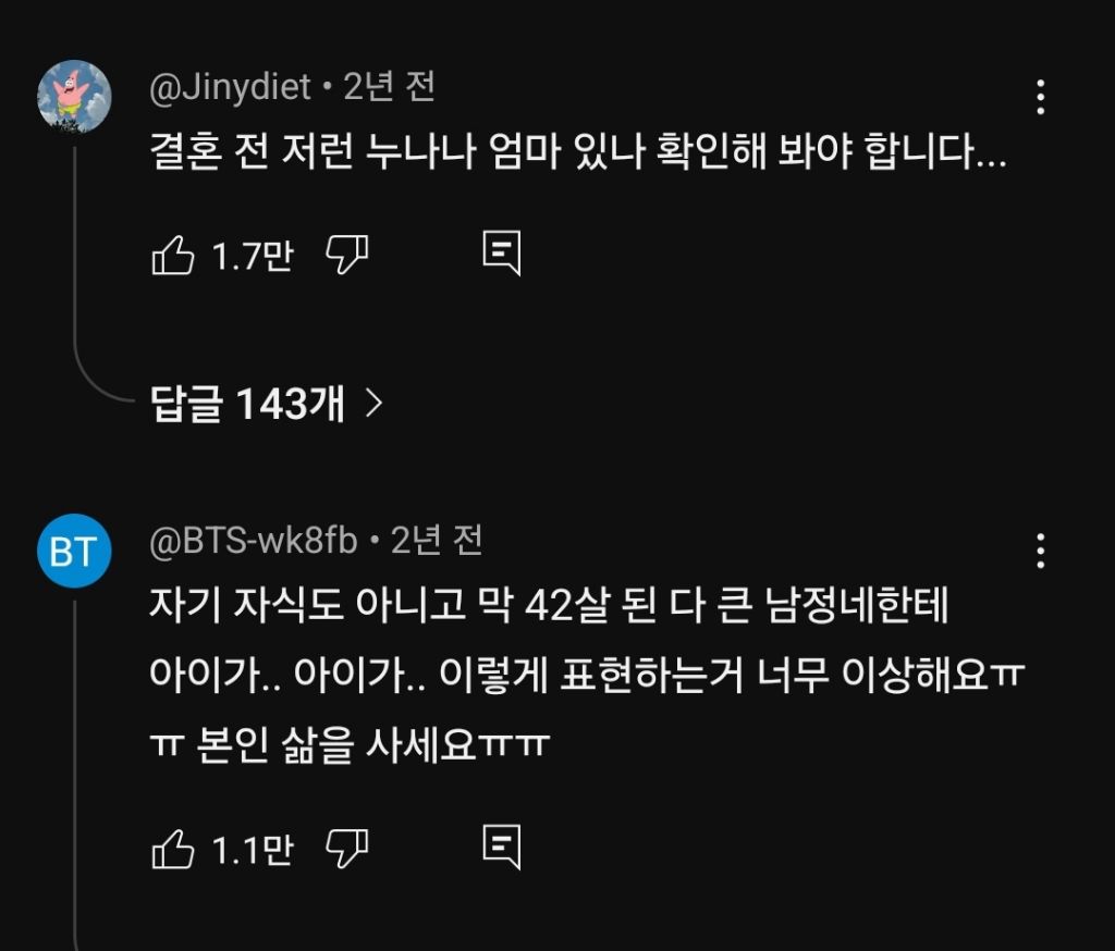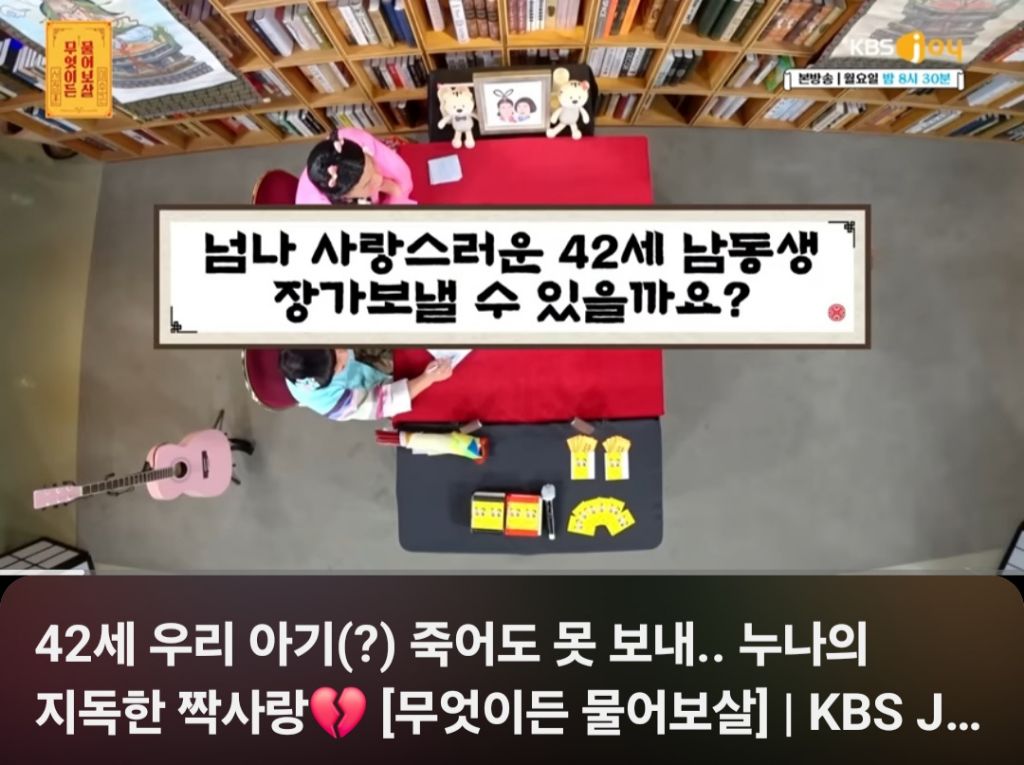 [스크랩] [흥미돋][무엇이든 물어보살] 42세 우리 아기(?) 죽어도 못 보내.. 작성자시간에기대어|작성시간25.11.12|조회수14,488 목록 댓글 45 글자크기 작게가 글자크기 크게가 출처: 여성시대 (따봉재석아 행운을줘)https://youtu.be/EmhRb0Sp_bk?feature=shared 다음검색 스크랩 원문 : *여성시대* 차분한 20대들의 알흠다운 공간 현재 게시글 추가 기능 열기 북마크 공유하기 신고 센터로 신고 댓글 댓글 45 댓글쓰기 답글쓰기 댓글 리스트 작성자나는지상에서천국을바란다 | 작성시간 25.11.12 예... 작성자짱구는 말려 | 작성시간 25.11.12 저래서 결혼을 못했나보네 여태ㅋㅋ 걱정하지마쇼 누나랑 평생 살듯 작성자퍼플콜라 | 작성시간 25.11.12 저런 방송 나오면 더더더욱 못할확률높아지지 작성자안태주. | 작성시간 25.11.12 세상에 작성자찬물에챠챠챠챠챠 | 작성시간 25.11.14 와 진짜 존나 징그럽다 .. 사람말고 저 누나의 생각이 댓글 전체보기