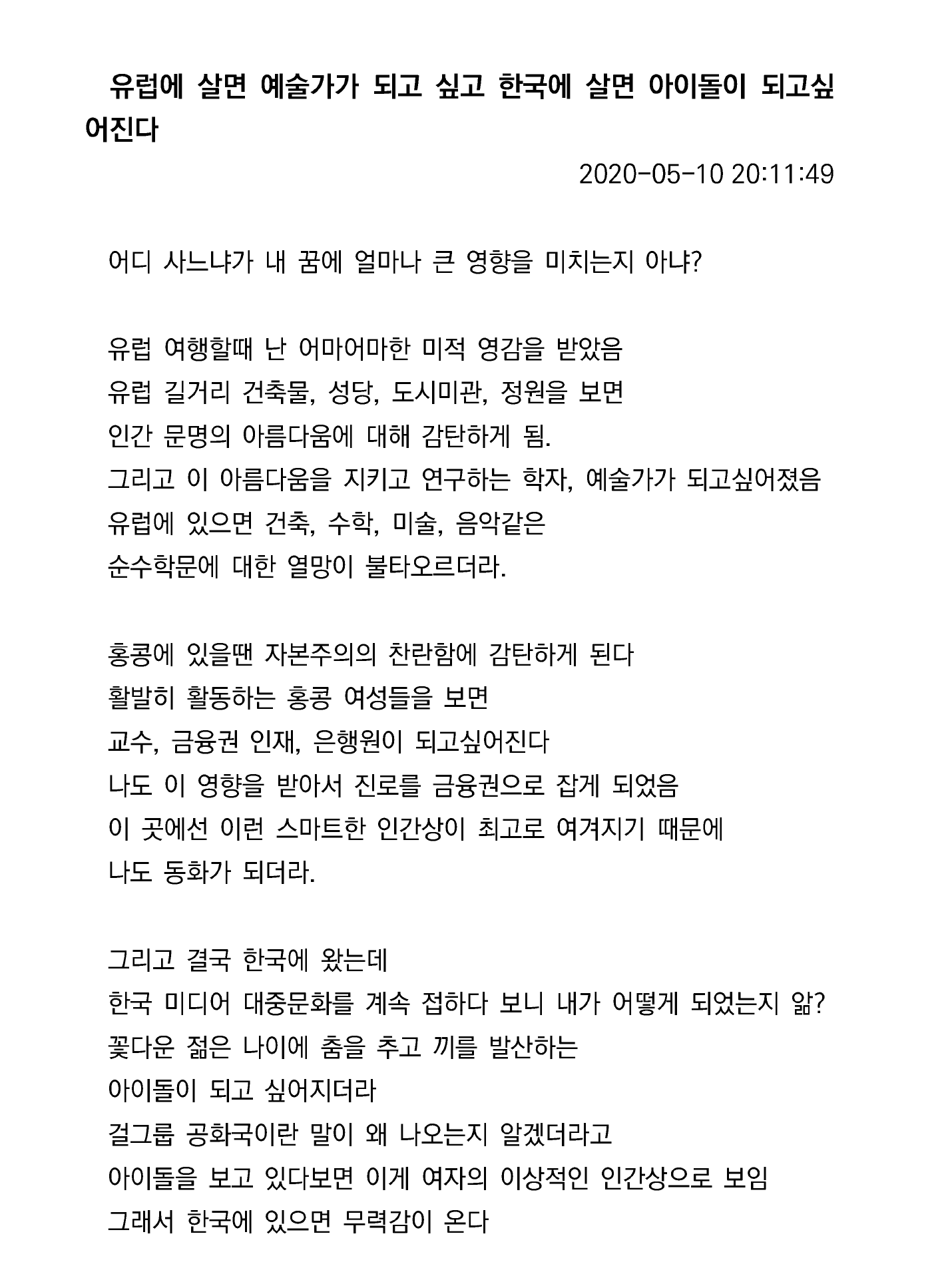 작성자닉네임에는 이모지를 사용할 수 없 작성시간 25.11.13 난 어릴때 남돌 콘서트 갔었는데 나랑 동갑인 남돌이 무대위에서 돈벌고 있고 그 아래 나는 관객으로서 소비만한다는 생각에 현타 온 적있음 그 때 나같은 사람이 모여 저 어린 남돌의 부를 채워준다는 생각에 나도 아이돌이 하고싶단생각을 어릴때 했던 적이 있음 근데 지금은 뭔가 나이드니까 저 직업의 천박함이 보이더라고 어린애들은 카메라앞에서 귀여운척 예쁜척하고 다 큰 어른들이 갓기갓기 거리면서 찬양해주고 나이든 아이돌들은 성숙한 음악하겠다면서 백날천날 손바닥만한 옷입고 섹시댄스 추고.. 이런생각 들면서 연예인에대한 관심이 싹 끊김