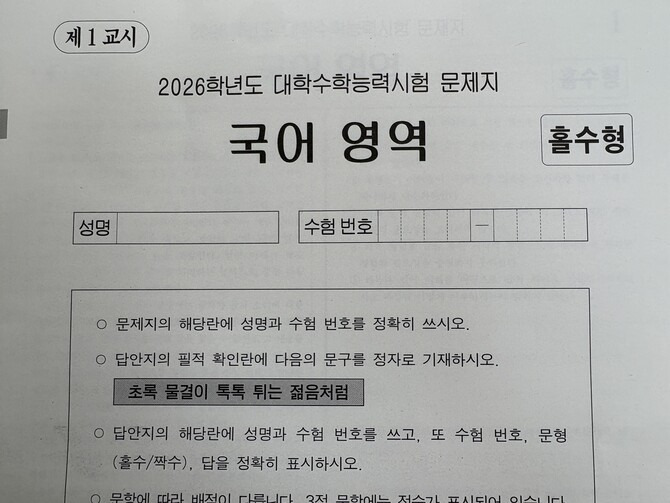 13일 치러진 2026학년도 대학수학능력시험(수능) 답안지에 실린 필적 확인 문구는 안규례 시인의 ‘아침 산책’ 가운데 한 구절이다.