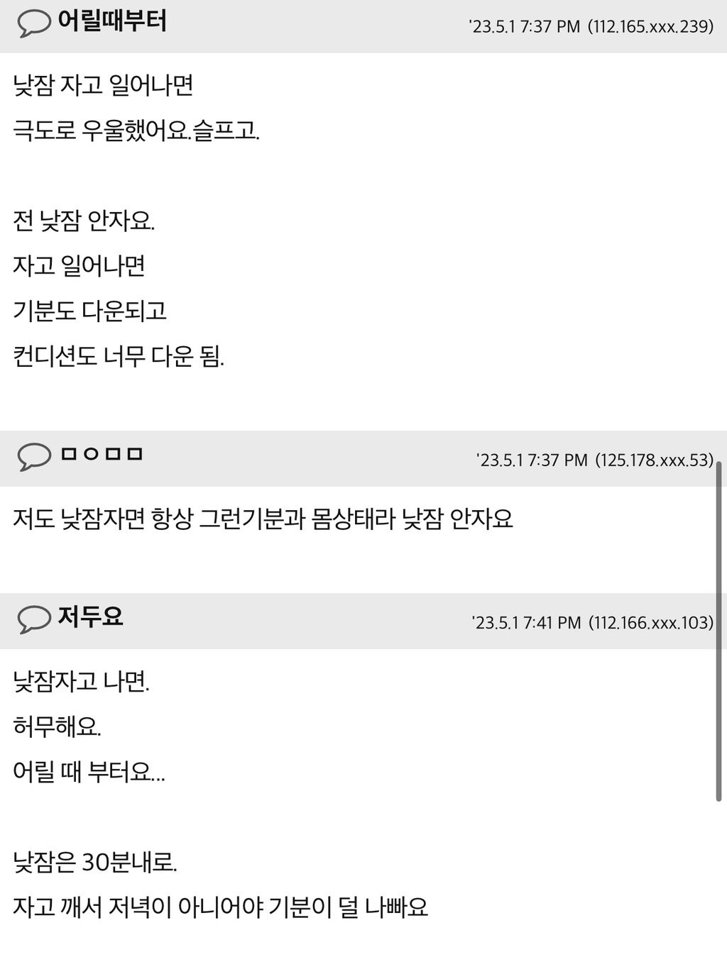 작성자우야우야우야야아 작성시간 25.11.13 나도 그래서 낮잠자는거 싫어해 진짜 시간 너무 아까움.. 개 쓸데없는곳에 시간 허비한 느낌임 잠은 밤에 자면 그만인데 ㅋㅋㅋ 그리고 컨디션 존나 안좋아져 두통 쩔어