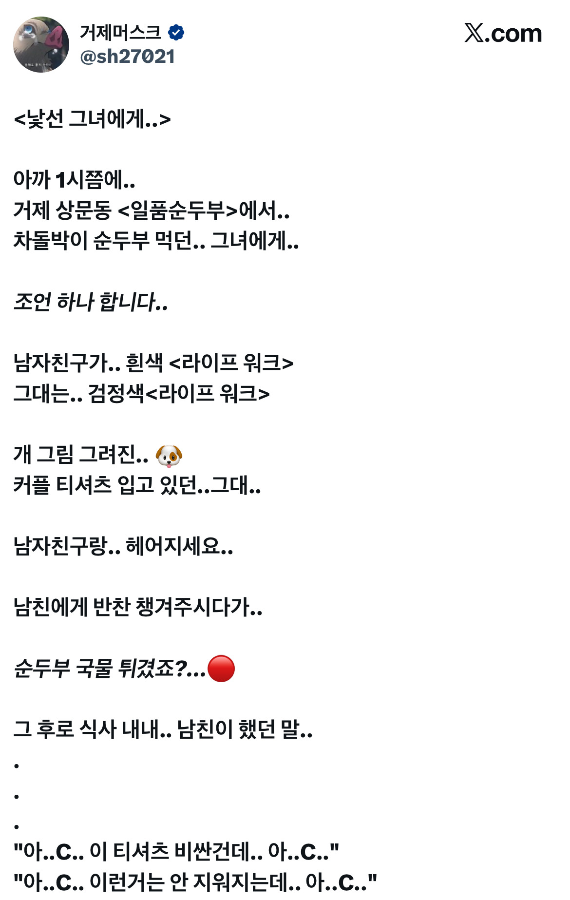 작성자달래 작성시간 25.11.13 어라 울집밑에 있는 순두부집이잖아 미친넘아 순두부가 아깝다