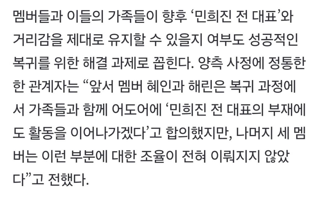 [기타]혜인과 해린은 복귀 과정에서 가족들과 함께 어도어에 ‘민희진 전 대표의 부재에도 활동을 이어나가겠다’고 합의했지만, 나머지 세 멤버는 작성자우익의농도|작성시간25.11.13|조회수39,344 목록 댓글 84 글자크기 작게가 글자크기 크게가 출처: 여성시대 우익의농도 복귀 협의 과정에서 큰 키워드가 민희진과의 거리 유지였던듯15분전 기사전문https://naver.me/5dAMUIgo뉴진스, ‘시간차 복귀’ 배경은 ‘멤버 간 온도 차’...완전체 복귀 가능할까11일 어도어 면담 과정서 복귀 입장 갈려 이후 12일 멤버 간 온도차 복귀 발표 민희진은 13일 “완전체 응원” 5인조 걸그룹 뉴진스 멤버 전원이 ‘어도어 복귀 의사’를 밝혔지만, 대중음악계에n.news.naver.com 다음검색 현재 게시글 추가 기능 열기 북마크 공유하기 신고 센터로 신고 댓글 댓글 84 댓글쓰기 답글쓰기 댓글 리스트 삭제된 댓글입니다. 답댓글 작성자박보검의 칸타우로스 | 작성시간 25.11.14 얼씨구 탈퇴한회원의 댓글 답댓글 작성자토니모니 | 작성시간 25.11.14 박보검의 칸타우로스 탈퇴..가 아니라 초기화일거야...ㅋㅋ.. 답댓글 작성자박보검의 칸타우로스 | 작성시간 25.11.14 토니모니 초기화한 회원의 댓글* 답댓글 작성자러마미 | 작성시간 25.11.14 박보검의 칸타우로스 여시같은애들땜에 팩트만 말해도 스토킹 싸불당하는지라 초기화 주기적으로 함^^~ 댓글 전체보기
