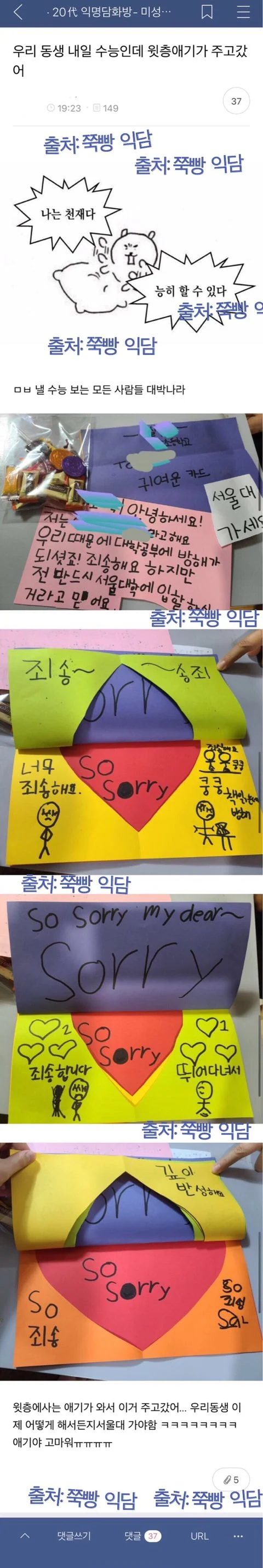[스크랩] [기타]우리 동생 내일 수능인데 윗층 애기가 주고감... 작성자오리털빵빵|작성시간25.11.13|조회수67,020 목록 댓글 158 글자크기 작게가 글자크기 크게가 다음검색 스크랩 원문 : 쭉빵카페 현재 게시글 추가 기능 열기 북마크 공유하기 신고 센터로 신고 댓글 댓글 158 댓글쓰기 답글쓰기 댓글 리스트 작성자스파게티먹고싶댜 | 작성시간 25.11.13 서울댘ㅋㅋㅋㅋㅋㅋㅋㅋㅋㅋㅋㅋ 작성자토피봐 | 작성시간 25.11.14 Sorry my dear뭐야ㅋㅋㅋㅋㅋㅋㅋㅋㅋㅋㅋㅋㅋㅋㅋ 작성자참치마유주먿빕 | 작성시간 25.11.14 귀여웤ㅋㅋㅋㅋㅋㅋㅋㅋㅋㅋㅋㅋㅋㅋ 작성자여시중독을멈처조요 | 작성시간 25.11.14 송죄 미치겠엌ㅋㅋㅋㅋㅋㅋㅋㅋㅋㅋㅋㅋㅋㅋㅋㅋㅋㅋㅋㅋㅋ 작성자너무더워죽겠어요 | 작성시간 25.11.14 송죄~~~~~ 밈될거같닼 댓글 전체보기