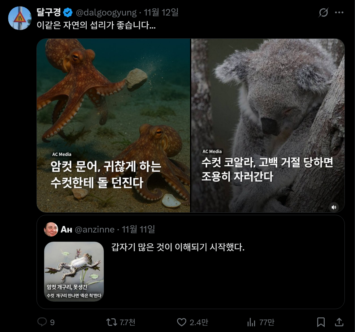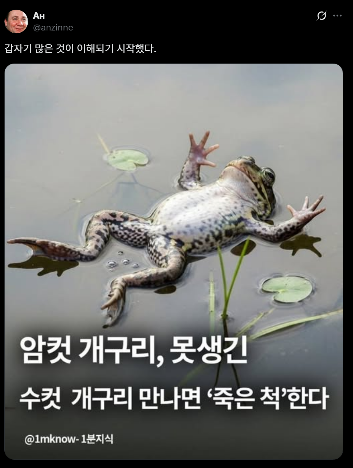 [흥미돋]갑자기 많은 것이 이해되기 시작했다. 작성자무기력자차|작성시간25.11.13|조회수4,813 목록 댓글 3 글자크기 작게가 글자크기 크게가 출처: https://x.com/anzinne/status/1988002011883991553?s=20 다음검색 현재 게시글 추가 기능 열기 북마크 공유하기 신고 센터로 신고 댓글 댓글 3 댓글쓰기 답글쓰기 댓글 리스트 작성자토마토오이 | 작성시간 25.11.13 왜 인간은… 작성자오늘은토요일 | 작성시간 25.11.13 수컷들은 치장도 열심히 하잖아 인간은 ㅅㅂ 작성자연예인 찬양 좀 그만해 | 작성시간 25.11.14 귀여웤ㅋㅋㅋㅋㅋㅋㅋㅋㅋㅋㅋㅋㅋㅋ 댓글 전체보기