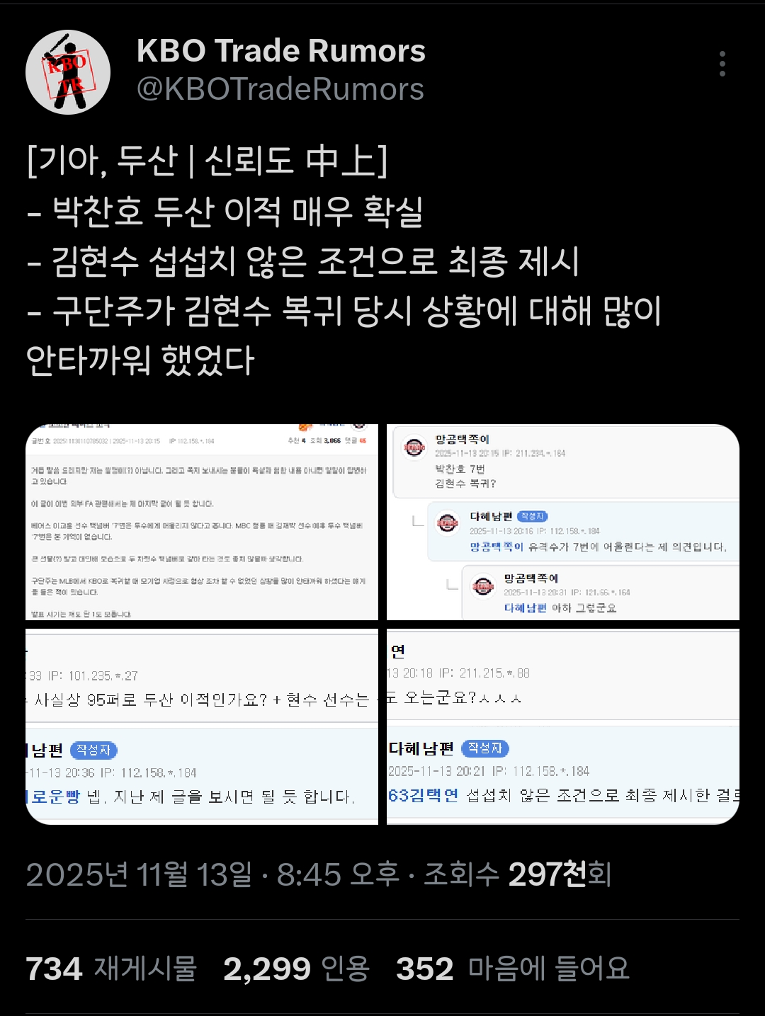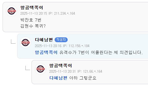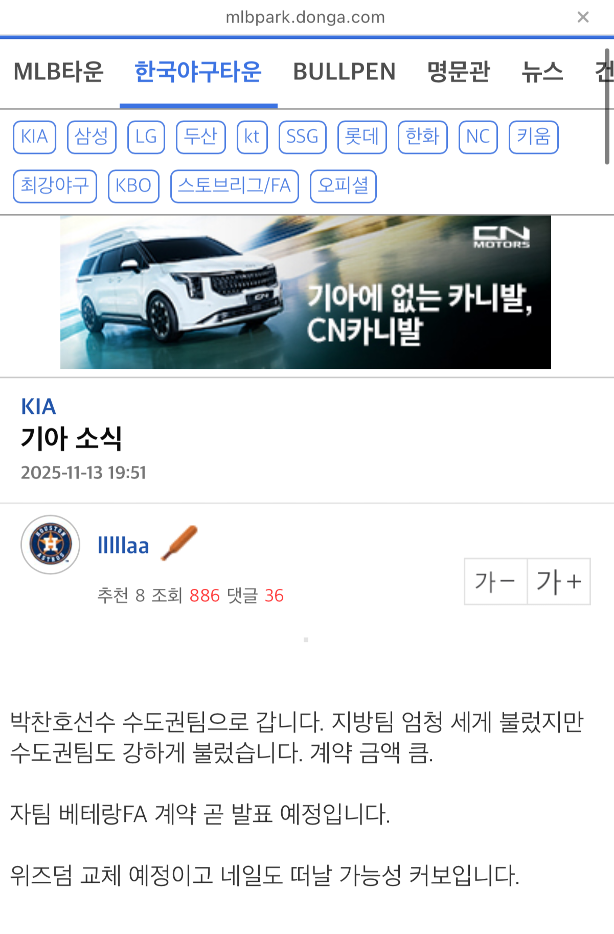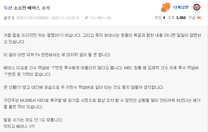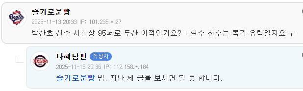 [흥미돋][KBO]두산행으로 흘러가는 듯한 기아 박찬호 이적썰(+엘지 김현수) 작성자(본인 닉네임),|작성시간25.11.13|조회수41,251 목록 댓글 204 글자크기 작게가 글자크기 크게가 출처: 여성시대 (본인 닉네임),https://x.com/KBOTradeRumors/status/1988936221150818386?s=19기아 1티어 썰쟁이도 글올림 다음검색 현재 게시글 추가 기능 열기 북마크 공유하기 신고 센터로 신고 댓글 댓글 204 댓글쓰기 답글쓰기 댓글 리스트 작성자차도녀정재형 | 작성시간 25.11.14 두산 갈거면 유퀴즈 왜 나왔냐, 롤렉스 반납하고 가라.......................그냥 가지 마라................ 작성자크로스밳 | 작성시간 25.11.14 시계나 두고가 작성자Wish you hell | 작성시간 25.11.14 네일아 가지마ㅜㅠㅠㅠㅠㅠㅠㅠㅠ 작성자이 의 리 | 작성시간 25.11.14 임네일 진짜 가냐…? 진짜…? 작성자쿨워러 | 작성시간 25.11.15 네일가지마 댓글 전체보기