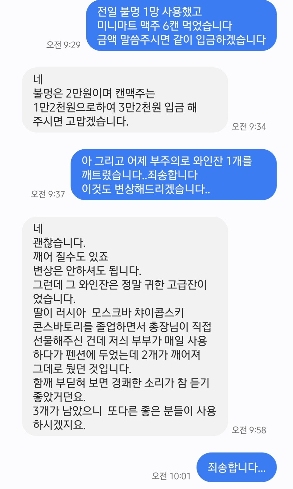 [스크랩] [흥미돋]에어비앤비 숙소에서 와인잔 깨뜨리고 사장님한테 받은 문자.jpg 작성자엿시씌|작성시간25.11.14|조회수58,389 목록 댓글 59 글자크기 작게가 글자크기 크게가 출처: 여성시대 셉템버https://theqoo.net/square/3544656149제발 변상하게 해주세요 다음검색 스크랩 원문 : *여성시대* 차분한 20대들의 알흠다운 공간 현재 게시글 추가 기능 열기 북마크 공유하기 신고 센터로 신고 댓글 댓글 59 댓글쓰기 답글쓰기 댓글 리스트 답댓글 작성자2025년최고의한해 | 작성시간 25.11.14 나보다 낫다.. 작성자추우니까추어탕 | 작성시간 25.11.14 ㅋㅋㅋㅋㅋㅋㅋㅋㅋㅋㅋㅋ 작성자mclaren | 작성시간 25.11.14 저 죄송합니다 라는 문장에서 착잡함이 절실히 느껴짐ㅋㅋㅋㅋㅋㅋㅋㅋㅋ 작성자Robert Glasper | 작성시간 25.11.14 따님이 정말 짱이시네요.. 작성자afhhkl | 작성시간 25.11.14 하 윗댓ㅠㅜㅜ 존나웃김 댓글 전체보기