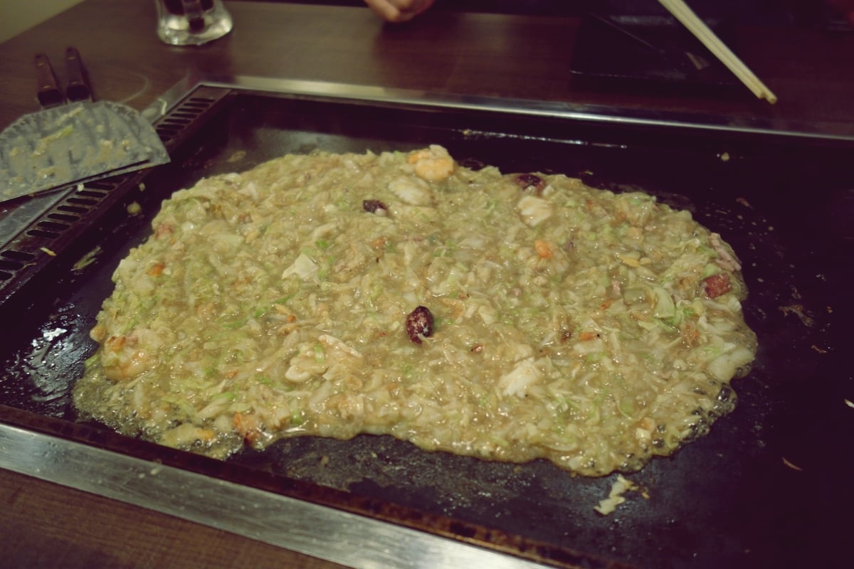 위가 조리 직전도 아니고 요리 끝난 모습. 저 익은 반죽을 각자 접시에 담아서 퍼먹는 음식임.