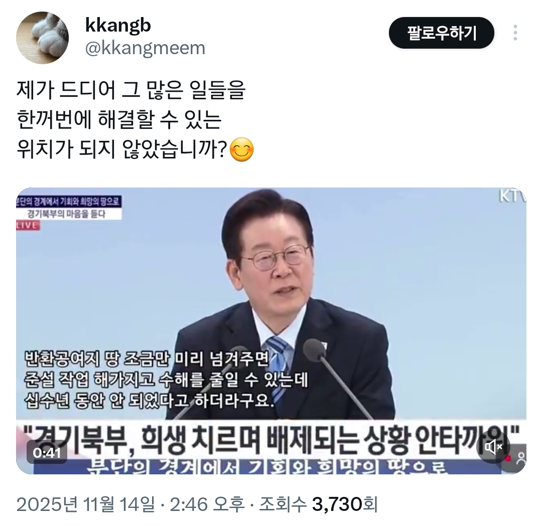 [흥미돋]이재명 대통령 : 제가 드디어 그 많은 일들을 한꺼번에 해결할 수 있는 위치가 되지 않았습니까?😊 작성자초장없는 브로콜리|작성시간25.11.14|조회수6,124 목록 댓글 69 글자크기 작게가 글자크기 크게가 출처: https://theqoo.net/square/3991268868?filter_mode=hot 다음검색 현재 게시글 추가 기능 열기 북마크 공유하기 신고 센터로 신고 댓글 댓글 69 댓글쓰기 답글쓰기 댓글 리스트 작성자보통보통 | 작성시간 25.11.15 너무 짧아 ㅠㅠ 작성자고온다습싫어예 | 작성시간 25.11.15 작성자1찍만행복하게해주세요 | 작성시간 25.11.15 됐고 연임해 작성자잼시지켜 | 작성시간 25.11.15 캬💙 작성자유익 | 작성시간 26.03.14 이리 하고싶어했던 사람을 ㅠ 크하......진짜 마음같아서는 독재시키고싶다 ㅜㅋㅋㅋㅋㅋㅋㅋㅋ 댓글 전체보기