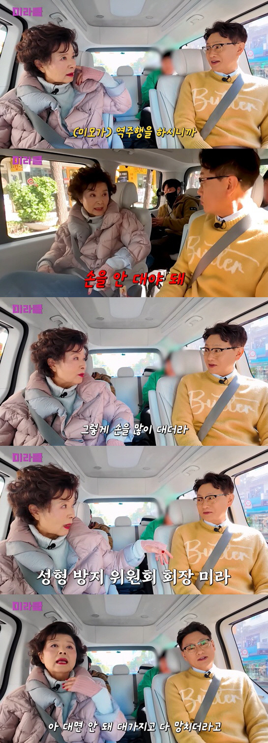 윤미라는 "역주행이 아니고 얼굴에 손을 안 대야 한다"고 미모 비결을 밝혔다. 이어 "요새는 남자 배우들도 얼굴에 손을 많이 대더라"라며 박형준을 향해 "너는 얼굴에 손 댄거 없지? 그러니까 자연스럽다. 앞으로도 절대 손 대지 말아라. 지금 좋다"고 성형을 하지 말라고 강조했다.