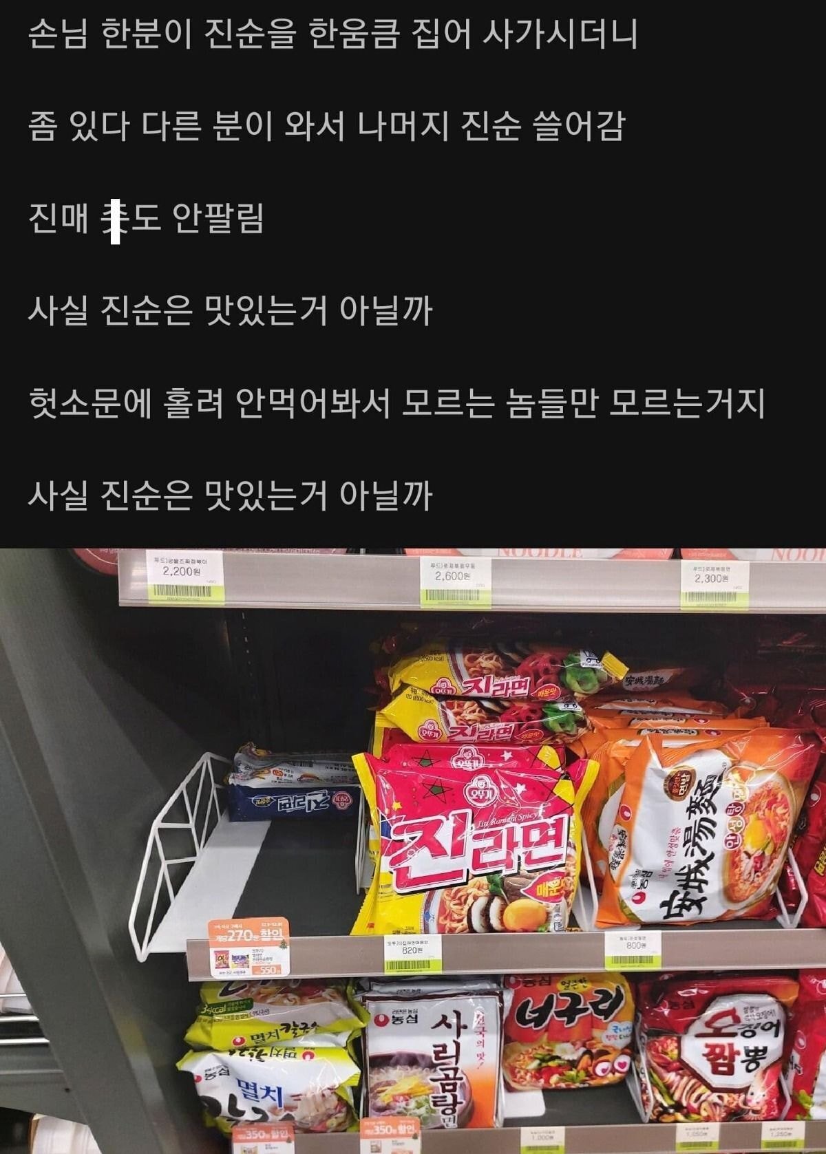 [스크랩] [흥미돋]진라면 순한맛 사실 맛있는거 아닐까 작성자열빙어|작성시간25.11.14|조회수13,444 목록 댓글 46 글자크기 작게가 글자크기 크게가 출처 : https://theqoo.net/square/2293999663진라면 순한맛 사실 맛있는거 아닐까 - 스퀘어 카테고리https://img.theqoo.net/DVSZh 당연함 맛있음theqoo.net 당연함 맛있음 ----- 나 진순이 악개라서 퍼옴 ㅋㅋㅋ 라면중에 존맛 진순이 다음검색 스크랩 원문 : *여성시대* 차분한 20대들의 알흠다운 공간 현재 게시글 추가 기능 열기 북마크 공유하기 신고 센터로 신고 댓글 댓글 46 댓글쓰기 답글쓰기 댓글 리스트 작성자서리태콩국수 | 작성시간 25.11.15 나 컵라면 강경 육개장에서 진순이로 갈아탔잖아 존맛임;;;; 작성자찰떡파이굿 | 작성시간 25.11.15 최애 작성자누룽지땀 | 작성시간 25.11.15 맛잇움 작성자전말하는감자예요 | 작성시간 25.11.16 존맛. 작성자아무튼즐기자 | 작성시간 25.11.17 나도 매운맛은 매운게아니라 너무짬 순한맛이 짠맛적당 댓글 전체보기