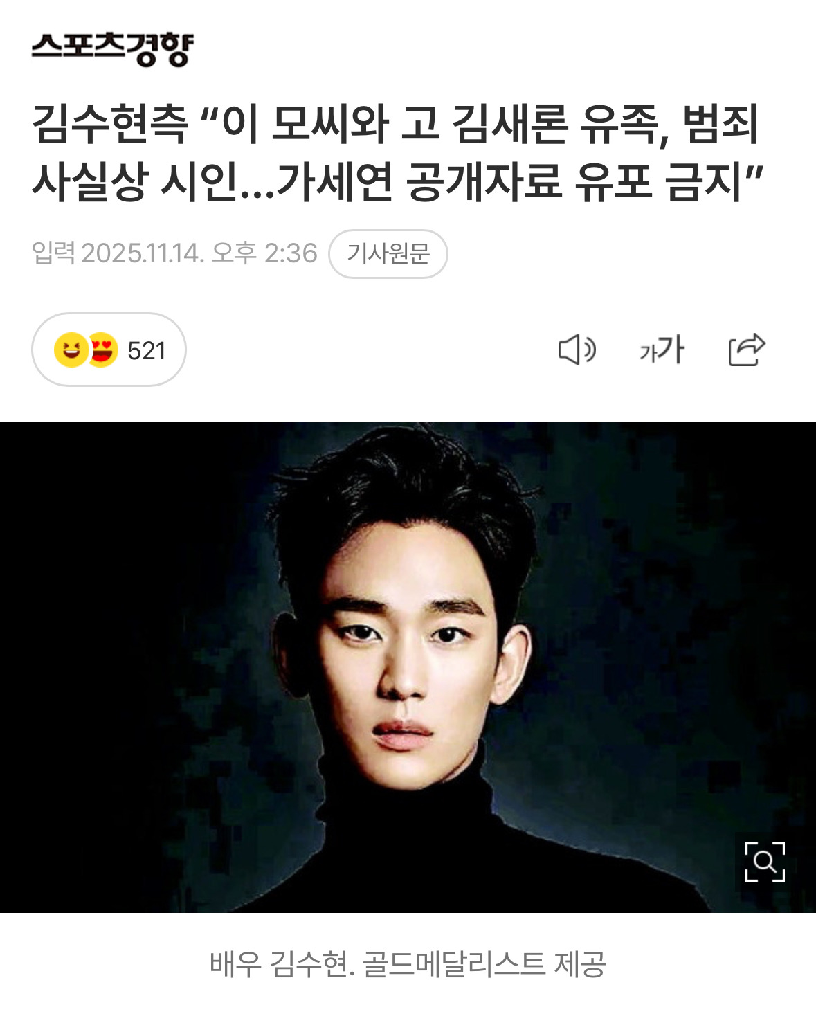 배우 김수현 대리인 고상록 변호사(법무법인 필)는 14일 “최근 유족 측의 입장이 확인됨에 따라 가세연이 저지른 대국민 사기 범죄의 실체가 모두 드러난 상황” 이라면서 “‘가세연’이 공개한 김수현 관련 자료를 온라인상에 유포할 시 법적 조치를 취하겠다”는 뜻을 밝혔다.