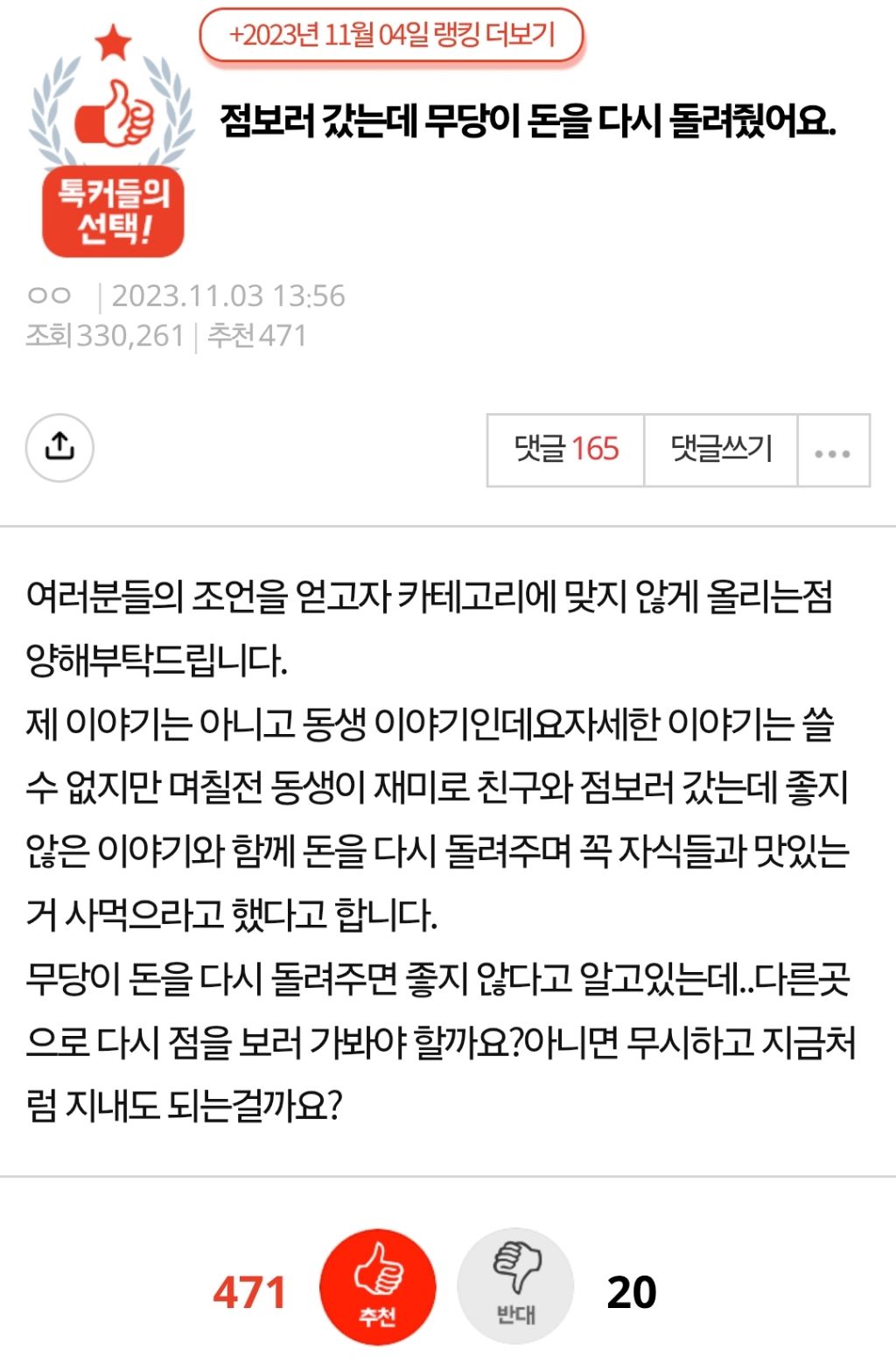 작성자베르나르베르베르 작성시간 25.11.15 나 한 10년 전쯤에 지인에게 비슷한 상황 있었는데 일주일뒤에 교통사고 남…