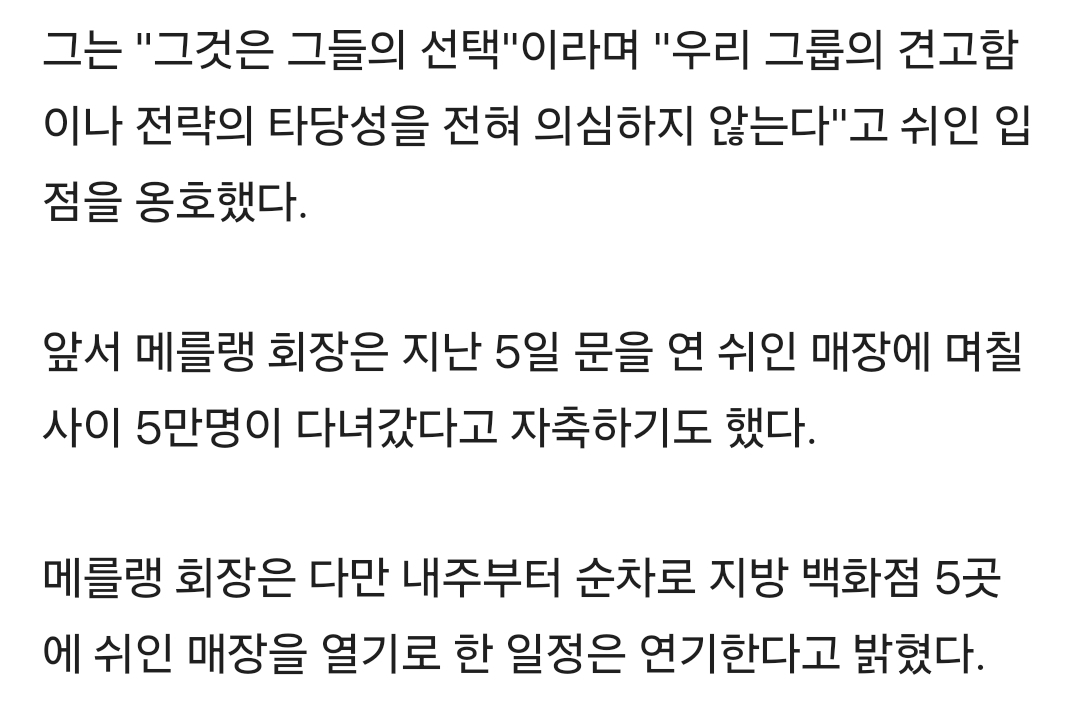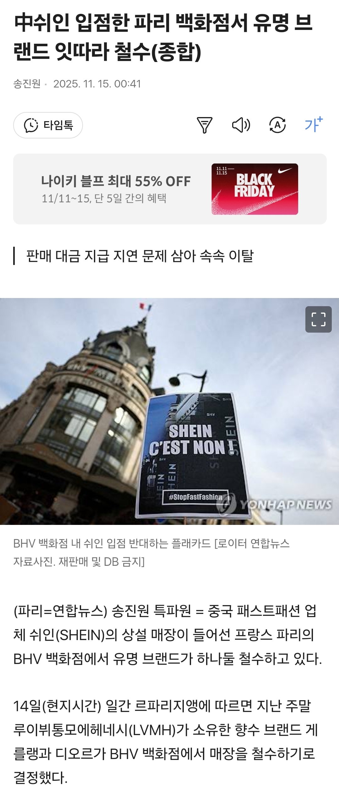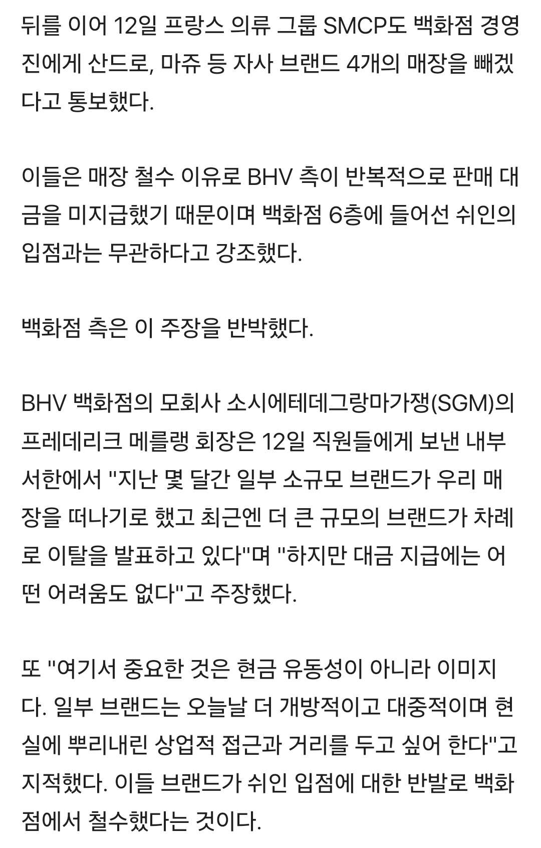 [여시뉴스데스크]中쉬인 입점한 파리 백화점서 유명 브랜드 잇따라 철수(종합) 작성자고운손고운발|작성시간25.11.15|조회수12,207 목록 댓글 12 글자크기 작게가 글자크기 크게가 출처: https://v.daum.net/v/20251115004139003 ... 전문은 출처로.. 다음검색 현재 게시글 추가 기능 열기 북마크 공유하기 신고 센터로 신고 댓글 댓글 12 댓글쓰기 답글쓰기 댓글 리스트 작성자온우주가말해 | 작성시간 25.11.15 니들 고객 다 중국인인데 답댓글 작성자온우주가말해 | 작성시간 25.11.15 아 쉬인 문제있구나 그럼 ㅇㅋ 작성자앙버터소금빵 | 작성시간 25.11.15 짜치긴함.. 답댓글 작성자앙버터소금빵 | 작성시간 25.11.15 윗댓보니까 더 이해가되네 ㅅㅂ;; 더러운새끼들 작성자대추동동 | 작성시간 25.11.16 브랜드 급자체도 너무 떨어지는데 미성년자 성착취 논란은 또 뭐야 ㅋㅋ우리나라 백화점에 쉬인들어온다면 나같애도 싫음 댓글 전체보기