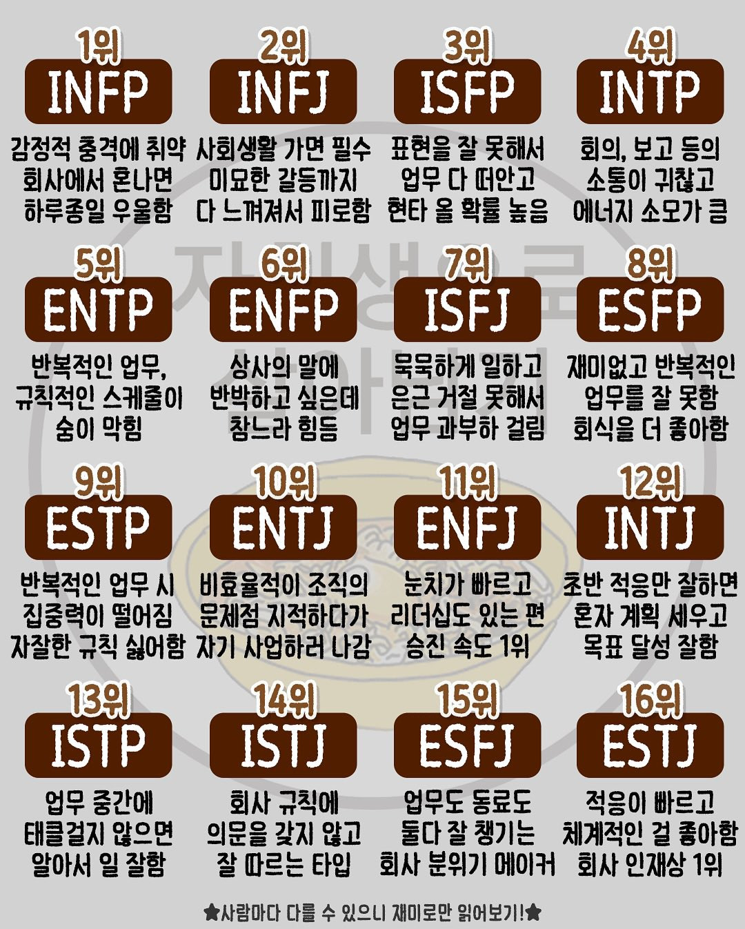 [흥미돋]회사생활이 빡센 MBTI 순위 작성자귤토끼이|작성시간25.11.15|조회수77,529 목록 댓글 68 글자크기 작게가 글자크기 크게가 출처: https://www.dmitory.com/issue/388681991 다음검색 현재 게시글 추가 기능 열기 북마크 공유하기 신고 센터로 신고 댓글 댓글 68 댓글쓰기 답글쓰기 댓글 리스트 작성자인생되는대류 | 작성시간 25.11.15 내향인들끼리 모아주세요… 작성자마피아 | 작성시간 25.11.15 Estj 체계적일땐 당연히 좋은데 체계적이지 못하면 개빡치는거임 작성자불신천국 | 작성시간 25.11.15 잇팁 백수 잘맞아요 작성자앙버터크림치즈 | 작성시간 25.11.15 아...맞아 회식을 더 좋아함ㅋㅋㅋㅋ회식이 일이었으면 직업 만족도 개 높을듯 작성자나무위소총든고양이 | 작성시간 25.11.19 잇티제인데 의문 존나 많이 갖고있는데... 댓글 전체보기
