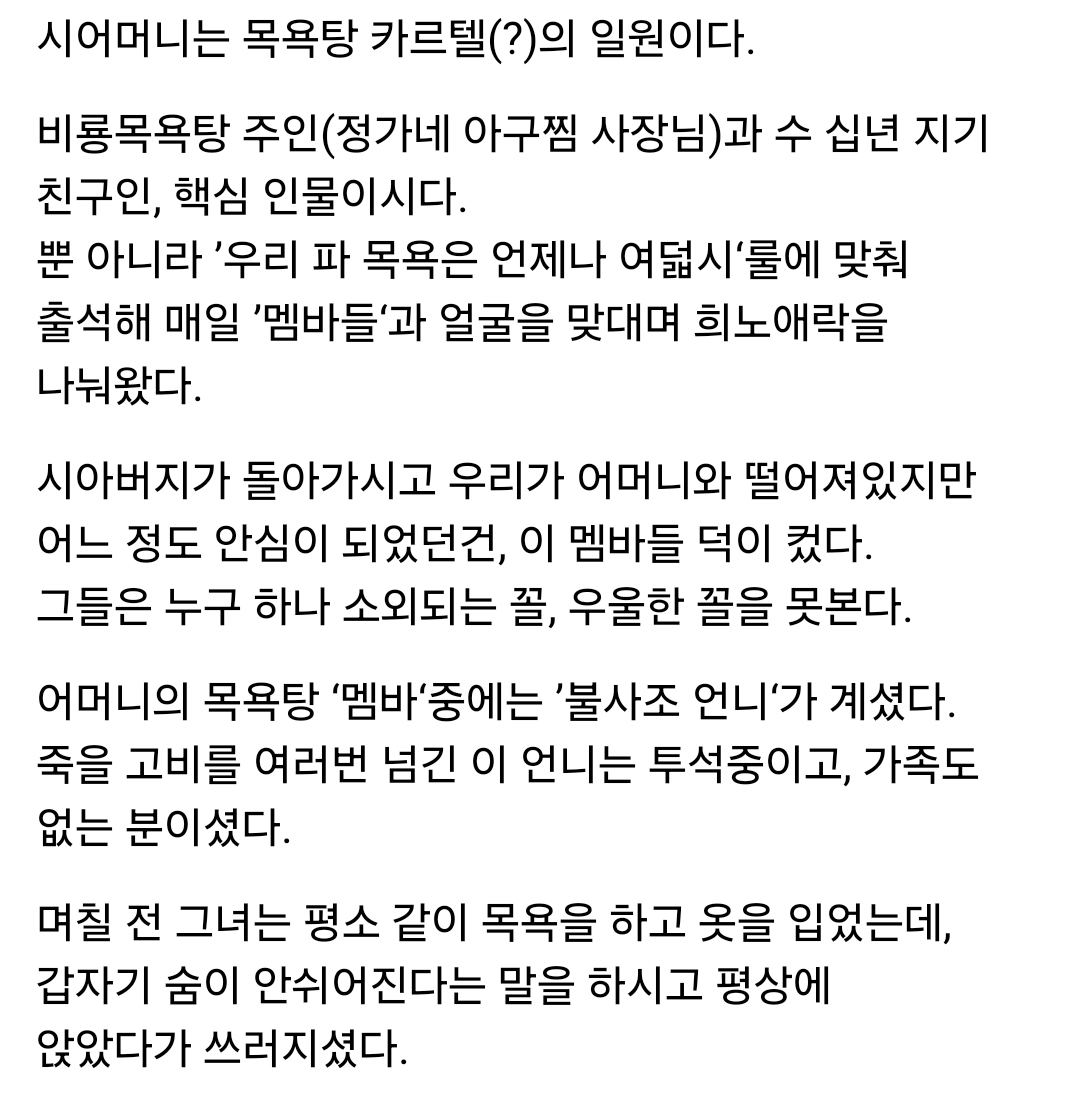 저기서 서로 음식 나누고 동네 소식 나누고 생일에 식사하시고 운동가고.