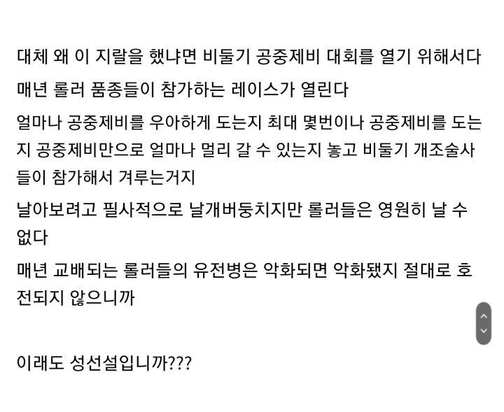 얼마나 공중제비를 우아하게 도는지 최대 몇번이나 공중제비를 도는지, 공중제비만으로 얼마나 멀리 갈 수 있는지 놓고 비둘기 개조술사들이 참가해서 겨룸.